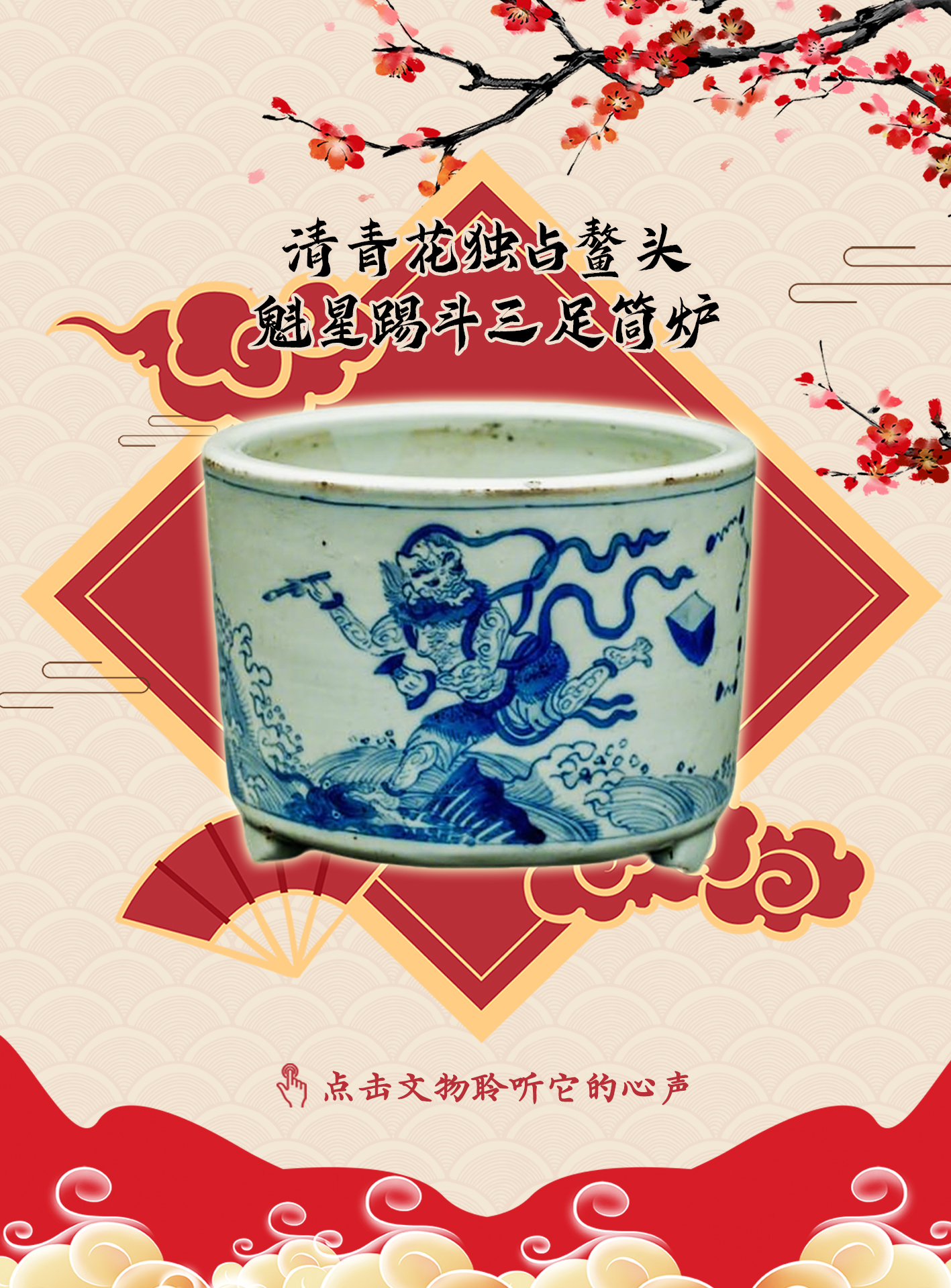 我是清代青花三足筒炉,立于无数书斋案头,瞧我这身上,魁星正踏鳌执笔,为世代学子点斗传福。“龙门一半在闽川”的壮志,在我升腾的香烟里淬炼;“一县七里三状元”的传奇,在我青白的釉面上映照。百年间,缕缕青烟在我身前萦绕,诉说着福建学子对文运昌隆最虔诚的期盼。