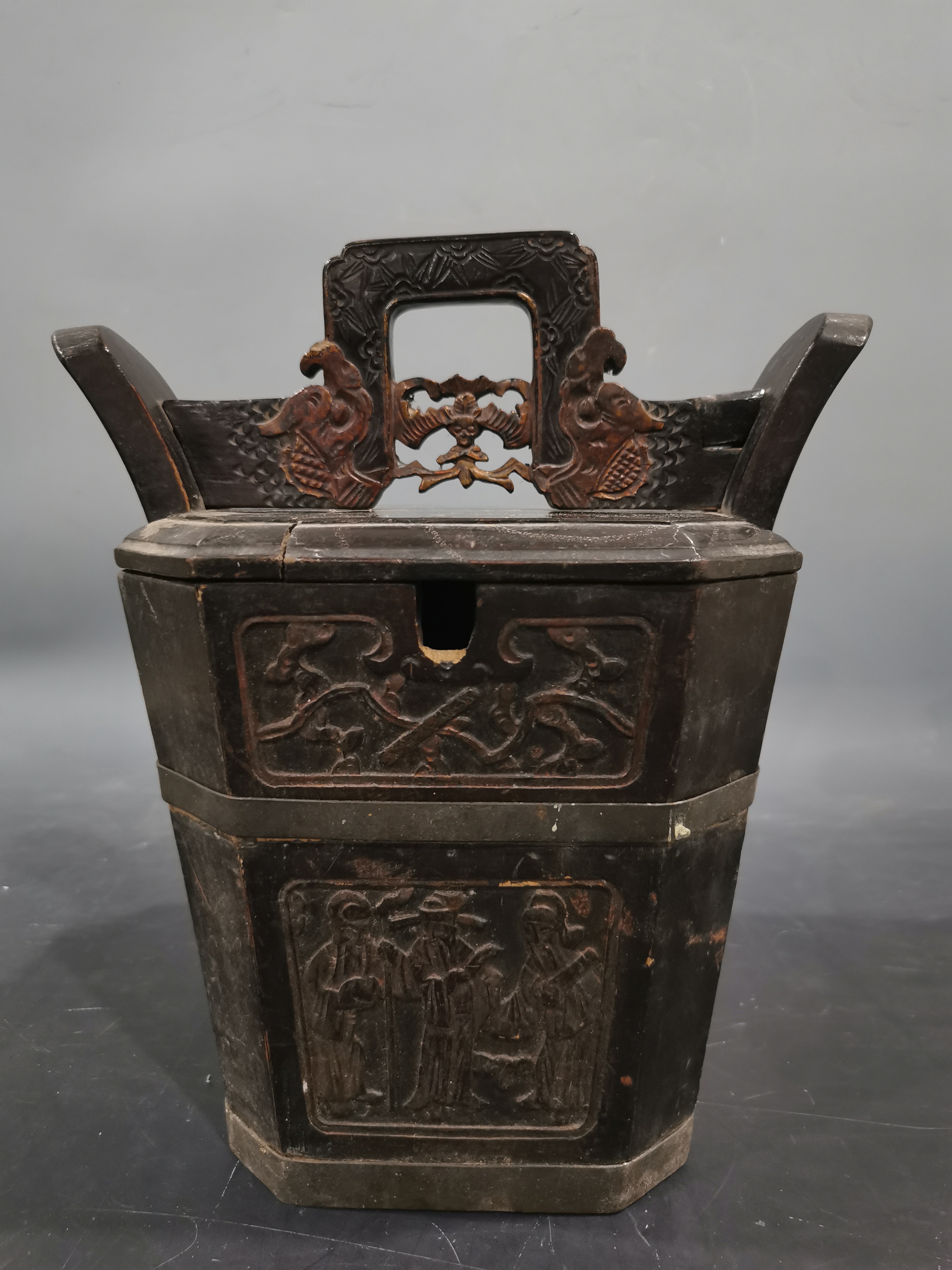 福建民俗博物馆收藏有一个清代金漆茶桶,高33厘米,以樟木为材质,桶身髹红漆,分为两层,桶盖浮雕“鱼化龙”纹,用来存储茶叶。还有一件民国时期的椿木福禄寿纹茶壶桶,提手处雕饰蝙蝠,正面雕福禄寿三星像,寄托吉祥平安之意、飞黄腾达之愿,可以用来保温茶壶。