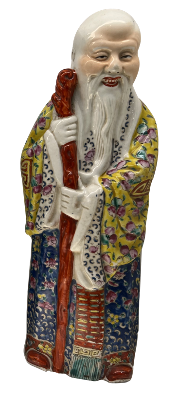 福建民俗博物馆藏有一组民国时期粉彩瓷“福禄寿三星”人物立像,高42厘米。福星神态安详,面色红润,身着粉彩锦袍,抱持金笑面童子,寓意福气绵绵;禄星神态威严端庄,身着粉彩官袍,腰扎官带,衣袂飘飘,手持如意;寿星前额突出,身着粉彩锦袍,纹饰繁复精丽,双手持杖,寓意长寿。