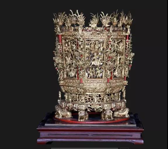 福建民俗博物馆收藏有一件清光绪年间的金漆木雕人物纹果盒。高48厘米,金漆木雕材质,由盒身、底座两部分组成,果盒呈筒形,中空,以镂雕、圆雕等工艺雕刻人物故事、花卉、瑞兽等纹饰,为民间祭祀、祈福等仪式用品。