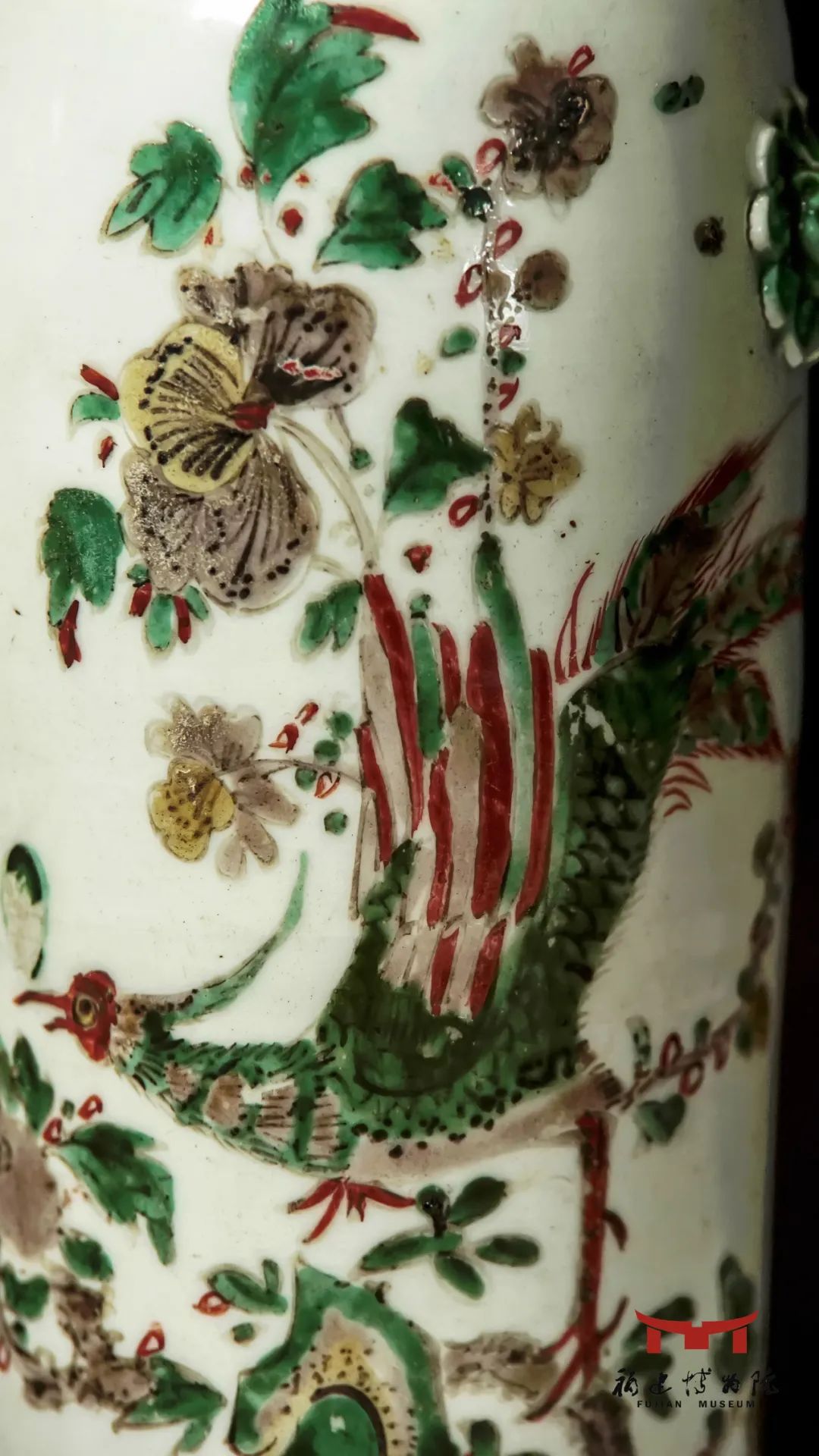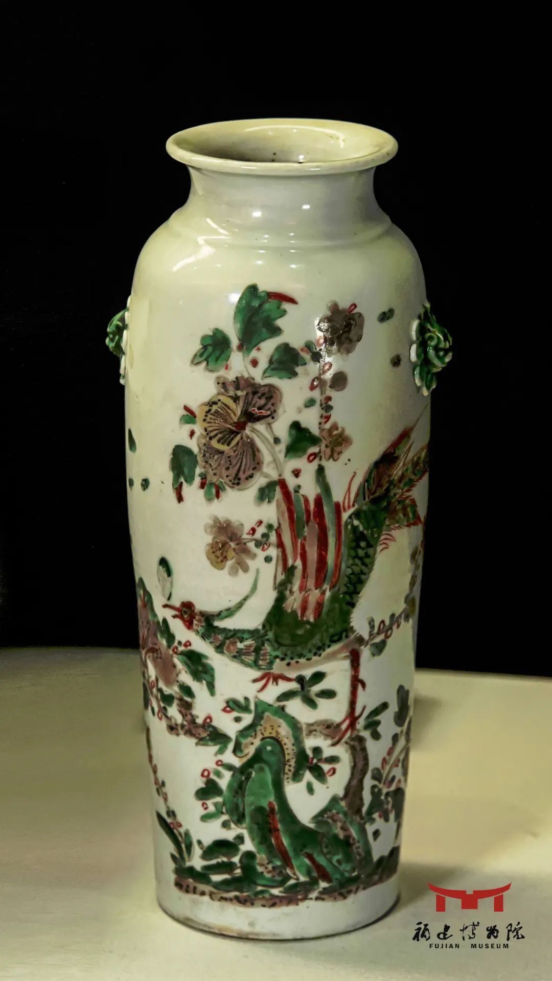 清代德化窑五彩花鸟纹瓶,肩腹间贴绿彩狮首双耳,壁间绘五彩锦鸡牡丹图案。