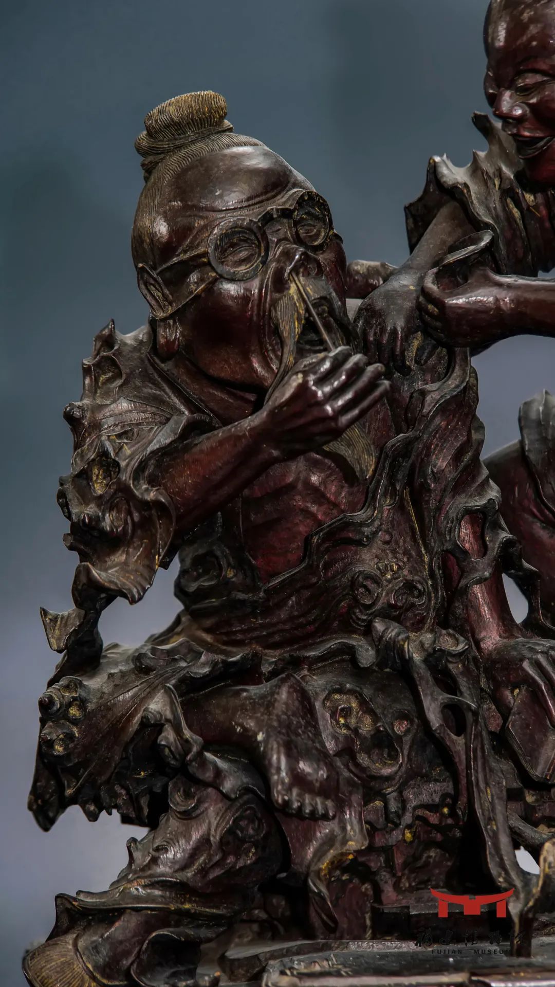 “醉酒”雕像,通高46厘米。老翁侧盘勾坐于长椅,抬头仰面,张嘴大笑,长须飞扬,双手舞过头顶,一副酣畅淋漓、喜不自胜的模样。身后的孩童端一酒杯,伸向老翁,仿佛一边说着吉祥话一边不停地在敬酒,这让老翁很是受用,乐而忘忧。