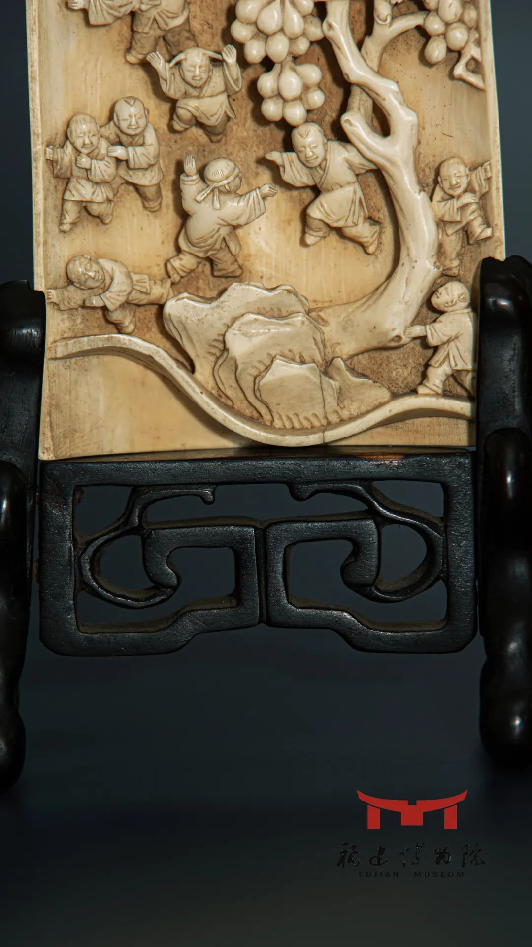 福建博物院藏有一件清代牙雕臂搁。臂搁为象牙质,雕刻了16名神态各异、正在嬉戏玩耍的孩童,他们天真顽皮、活泼好动的天性被生动逼真地刻画出来,令人心生怜爱。中间一棵枝干遒劲有力、叶蔓婉转多姿、果实累累的葡萄树,又巧妙地将众多孩童合理区隔,使得作品繁而不乱,错落有致,体现了超乎一般的匠心和技艺。