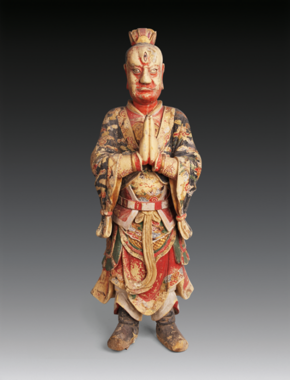 位于泉州的中国闽台缘博物馆收藏有一尊明彩绘木雕金刚立像。通高92.3厘米,头束发冠,额上镶有一个眼睛,内着金色铠甲,腰束玉带,外披绘有五彩祥云纹的开衫,双手合掌举于胸前,双脚穿鞋站立。神像表面用白粉打底后,以红、黄、绿、黑、金等色彩描绘,面部表情威严深邃,衣饰色泽鲜艳亮丽,衣褶线条纹理舒展,柔美流畅。整体形象古朴大方,富有层次和重量感,是明代木雕彩绘佛像中的珍品,为国家一级文物。