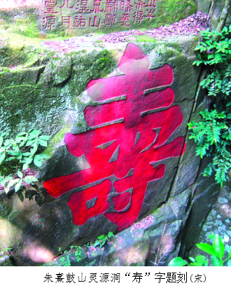 灵源洞是鼓山摩崖石刻最集中处,有宋朝以来的真、行、草、隶、篆书体的题刻100多段。灵源洞前蹴鳌桥下,靠西山壁上藏着一个巨大的“寿”字,署名“晦翁”。后人根据署名认为是宋代理学大家朱熹所书。该石刻为楷书,字高4.15米,宽3.05米,刚劲敦厚,是鼓山单字最大的摩崖石刻,同时也是福建省内少见的大字摩崖石刻之一。“寿”字藏在桥下,“藏寿”谐音“长寿”,寓意美好。相传,朱熹在福州地区写有“福、寿、康、宁”四个大字。“福”在乌山;“寿”在鼓山;“康”在长乐;“宁”在福清。其中“寿”字最大,也最出名。