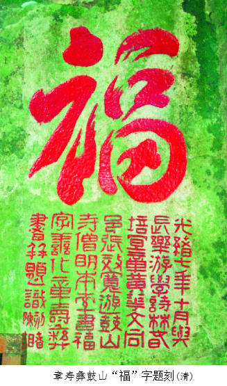 福建是有福之地,福州是有福之州,“福”字自古就是福建、福州的特色文化和核心内涵。因此鼓山不仅藏“寿”,而且处处显“福”。灵源洞东面,有一处字径64厘米的“福”字石刻,题字者为清代画家章寿彝;灵源洞口溪涧石上也有一处仰天石刻,书“福联”二字;鼓山降龙洞边,有一处圆形摩崖,这处“福”字字径约13厘米。