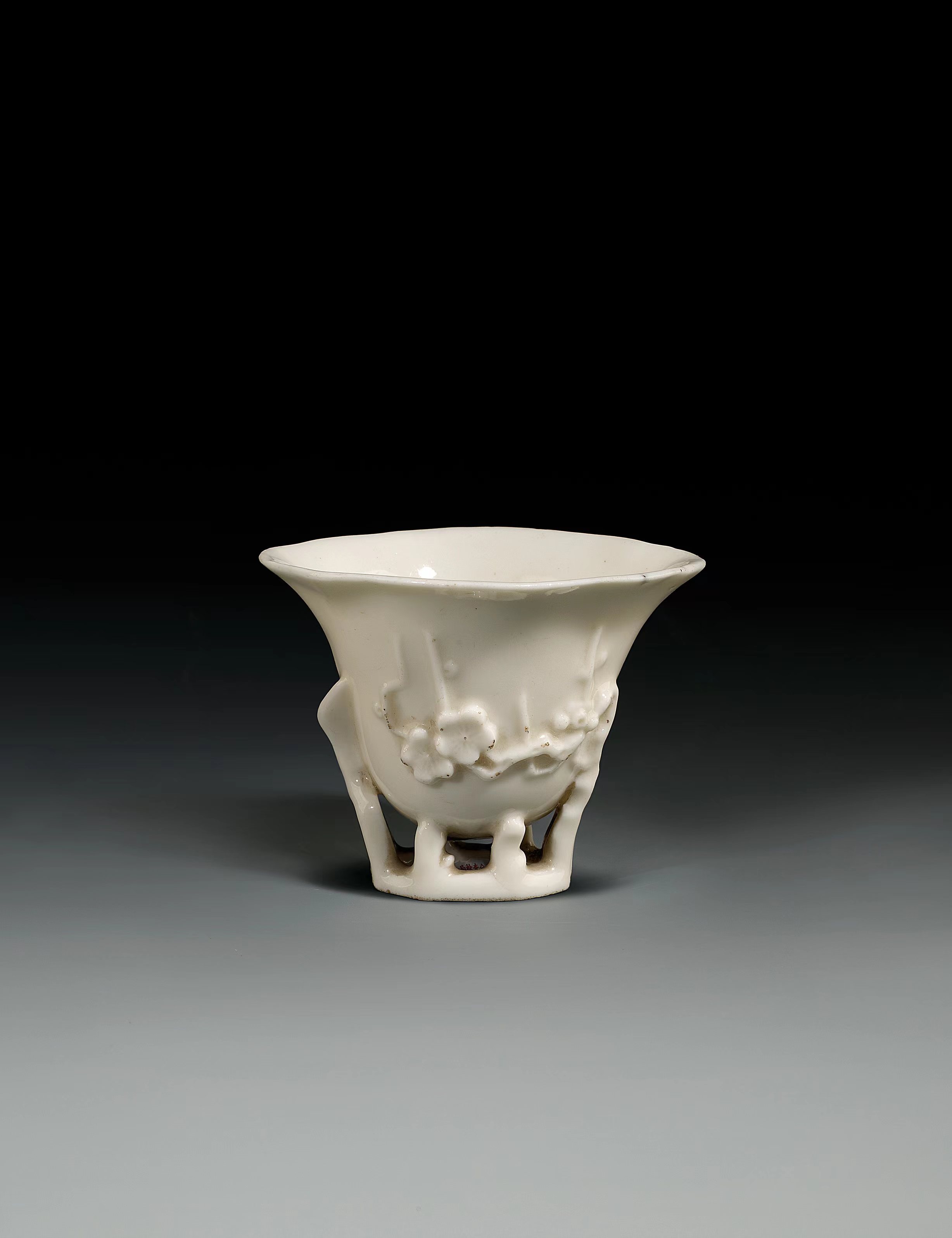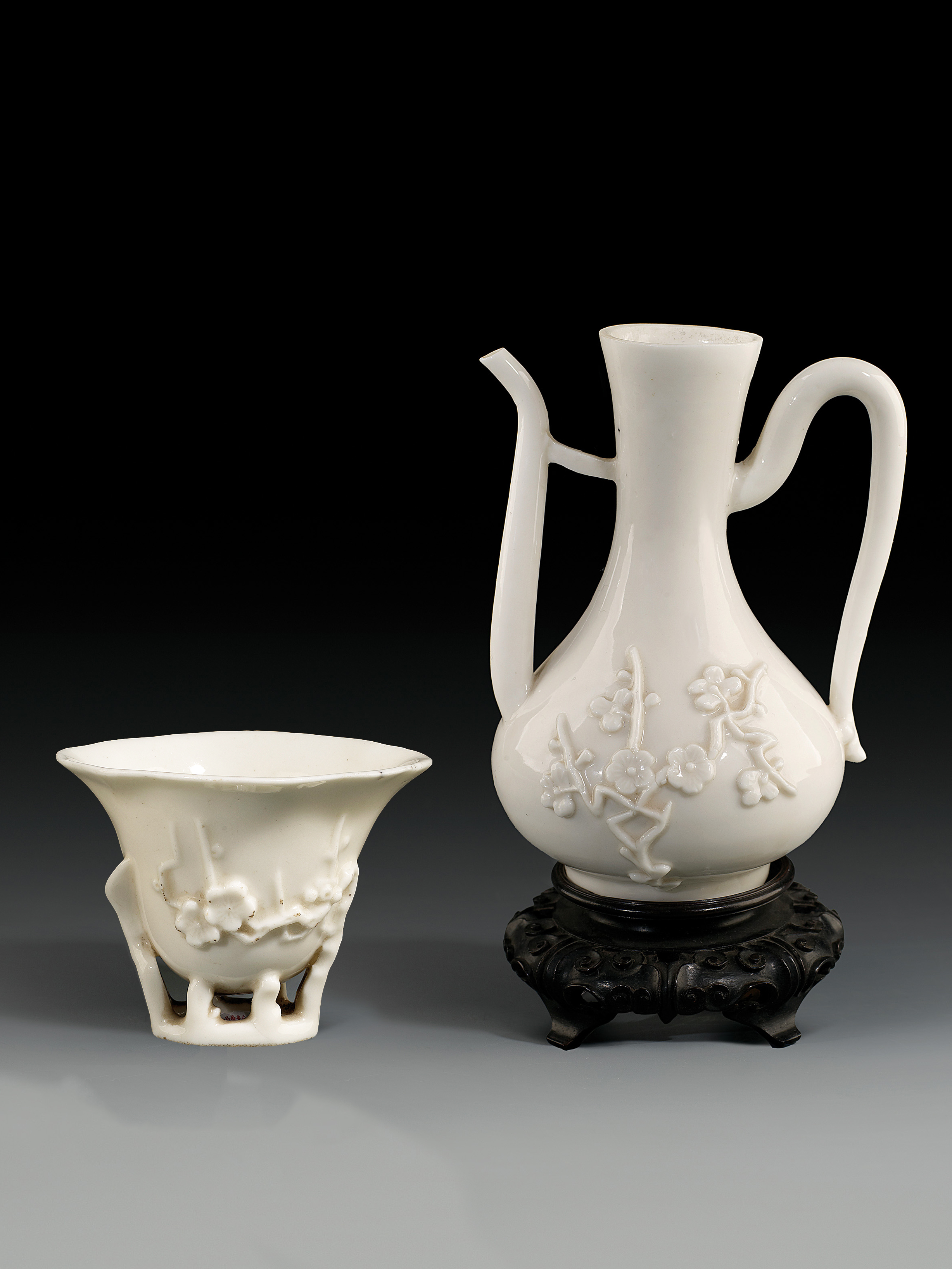 福建民俗博物馆收藏有清代德化窑梅花纹提壶和梅花杯。提壶高15.8厘米,撇口,长颈,溜肩,鼓腹,圈足,腹部两面堆塑梅花纹饰,枝干苍劲有力,花瓣纹理清晰可辨。梅花杯高7厘米,小巧精致,内外施白釉,外壁堆塑梅花纹饰。