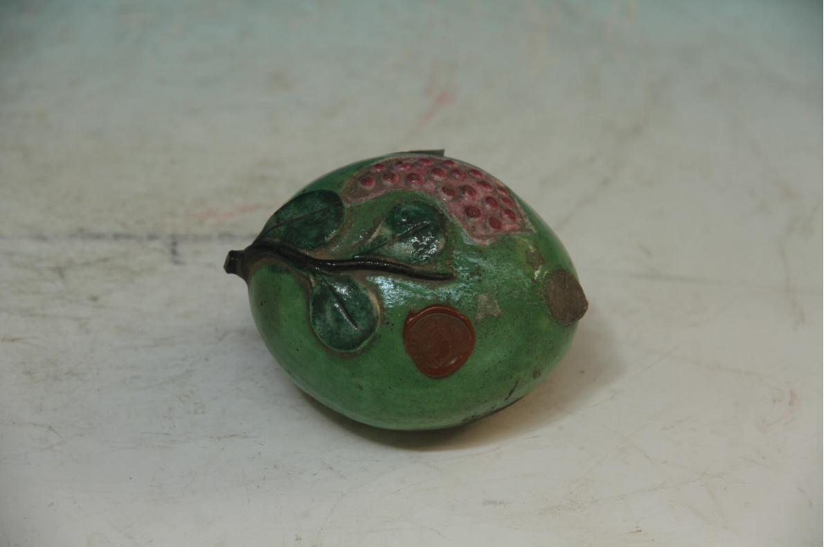 福建民俗博物馆收藏有一组民国时期的粉彩仿生瓷果,造型有橘子、佛手瓜、石榴、荔枝、花生、桃子、桂圆等。佛手瓜瓷果,长12.5厘米,宽10.5厘米,高6.5厘米,黄中带点青绿色,枝叶曲卷缠绕在上端,惟妙惟肖。