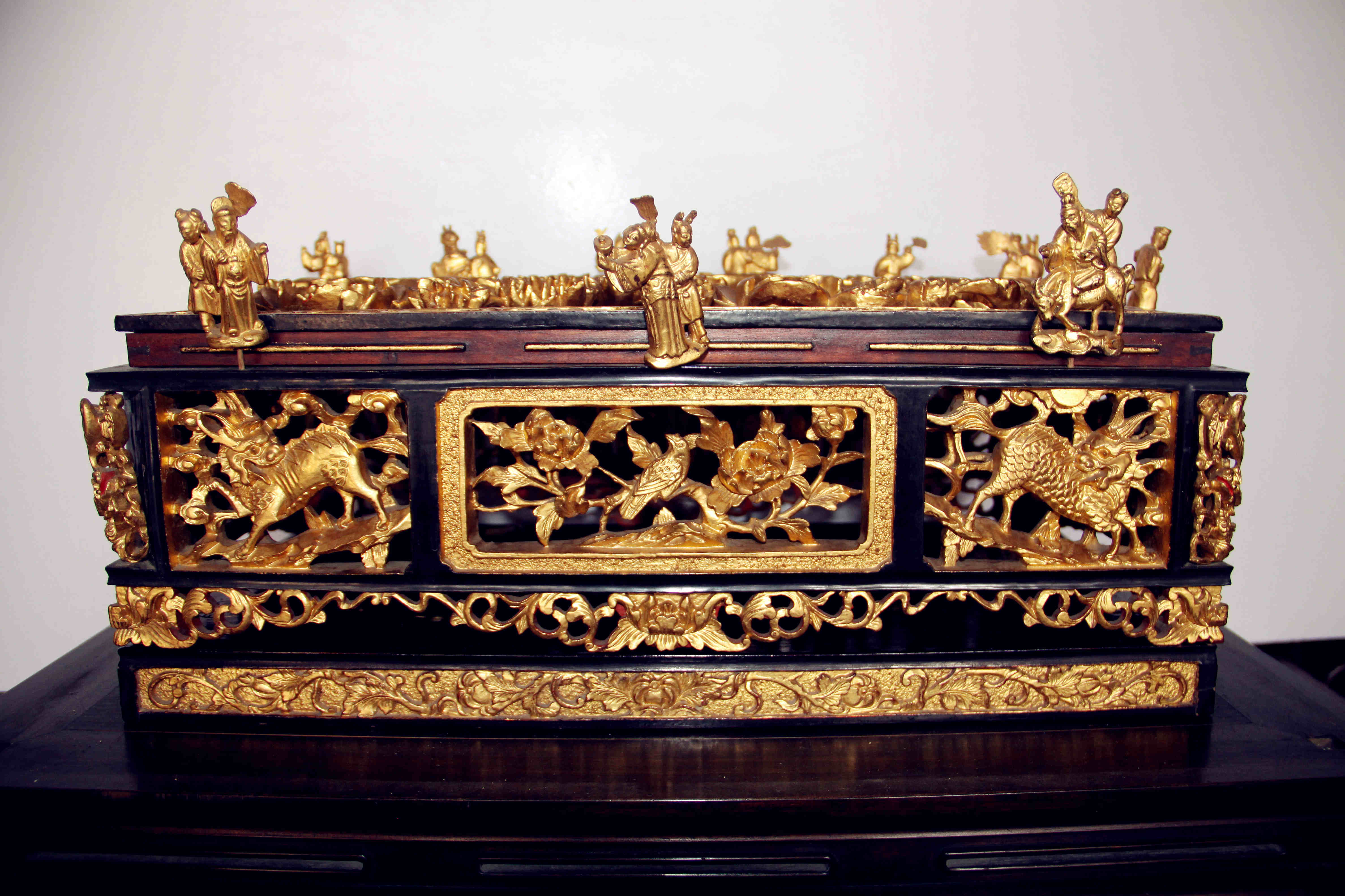 受地域和信俗文化的相互影响,沿海邻省如广东潮汕的金漆木雕、浙江宁波的朱金漆木雕等也常见此类礼器,髹漆、贴金等制作工艺不尽相同,但都用于祭祈活动中盛放供果。纹饰多为传统历史典故、八仙人物、花卉瑞兽等,寄寓了讴歌先贤、向往美好生活的文化理念。