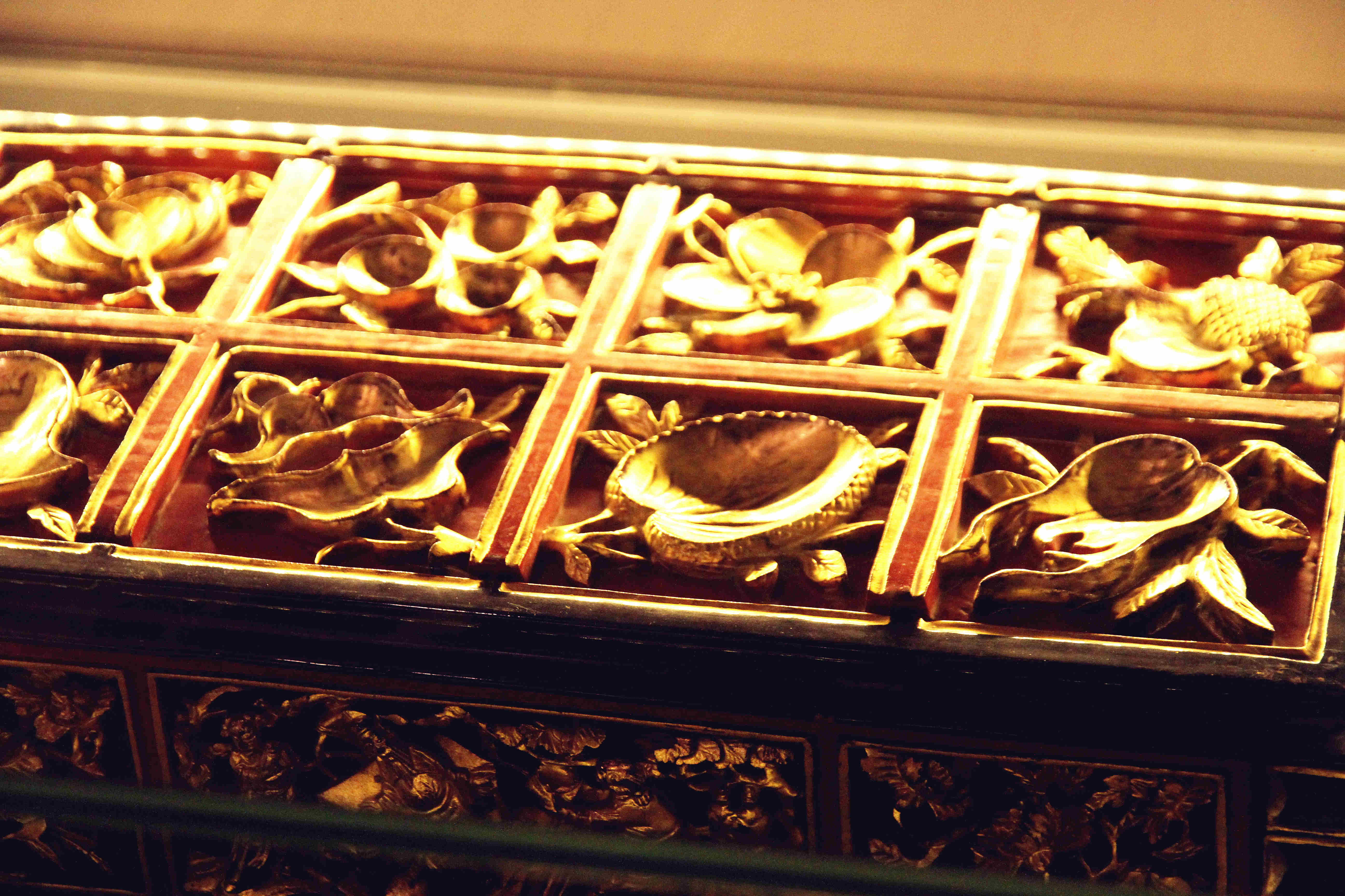 福建祠堂、庙宇里最常见的就是流光溢彩的金漆木雕礼祭器具,金漆木雕果盒是其中之一,常与神龛、馔盒、龙烛、香炉、桌灯等组合用于祭神祀祖的仪式,富裕人家日常生活中也将其置于室内的案几上,摆放水果和糕点,可以说是既入庙堂,又进厅堂。