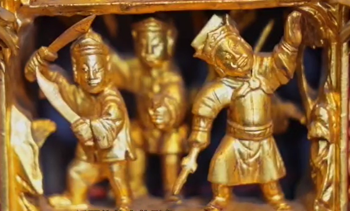 福建民俗博物馆收藏有一件清光绪年间的金漆木雕人物纹果盒。高48厘米,金漆木雕材质,由盒身、底座两部分组成,果盒呈筒形,中空,以镂雕、圆雕等工艺雕刻人物故事、花卉、瑞兽等纹饰,为民间祭祀、祈福等仪式用品。