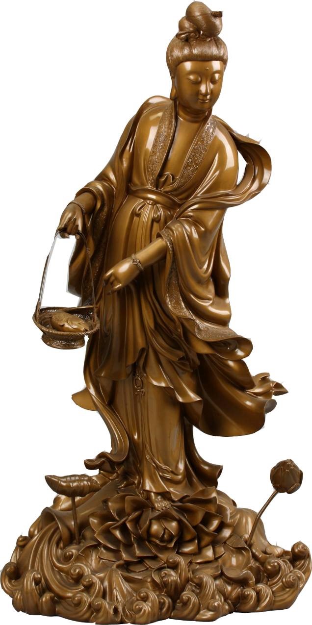 这件近代沈正镐脱胎提篮观音现收藏于福建博物院,国家一级文物。沈正镐制作的古铜色观世音菩萨立像,头戴冠,冠前正中嵌小珠,圆脸细目,面容端庄丰满,微含笑意,含眸下视。三绺长须垂腹,身着龙袍,腹饰玉带,左手贴膝,右手执如意,收于腹下,足登高履,双腿交叉端坐,神态文静。整尊造像通高75.5CM,底径为37CM,通体古铜色,观音面盘端庄丰满,头梳高髻,含眸下视,肩披长带,身着通肩花边大衣,腰部束花结带,长裙曳地,双手带镯,右肘前曲,手提鱼篮,左手收贴右腹下,赤足立于浪花翻卷的荷花座上。整尊塑像呈古铜色泽,隐隐泛着金属的光泽,手感光滑柔润,这是福州特有的漆器工艺“薄料”技术和“揩清”技术所赋予的独特美感。“薄料”技术是将金银箔研磨成粉均匀的混入色漆中,用手掌的大鱼际部位仿佛均匀的拍打敷色其上的,而“揩清”技术则是在打磨很平滑的基础上用提庄漆混合生油均匀敷搽其上,再用手掌来回揩磨直至光泽显现。
