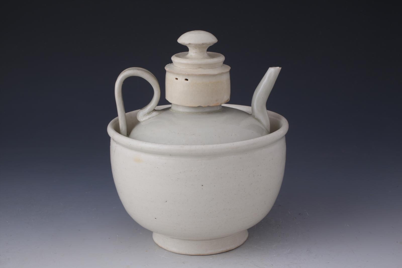 宋青白釉带盖瓷执壶(带温碗)于2012年征集购买。碗口径17.7cm,圈足9.7cm,通高20.7cm,碗高12.0cm,壶口径4.4cm,壶腹围45.9cm,壶底径7.5cm,壶高15.3cm。温壶:直口,筒颈,溜肩,圆鼓腹,矮圈足。配有圆形钮盖,肩腹部对称置有一扁状把和尖嘴圆管弯流。温碗:敛口,圆唇,深弧腹,圈足。注壶置于温碗内,碗口与注壶的肩部相齐。通体施青白釉,器形规整,釉质温润,保存完好。