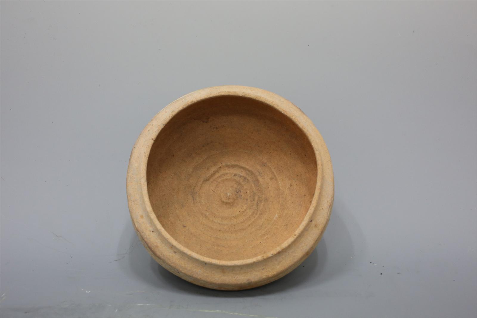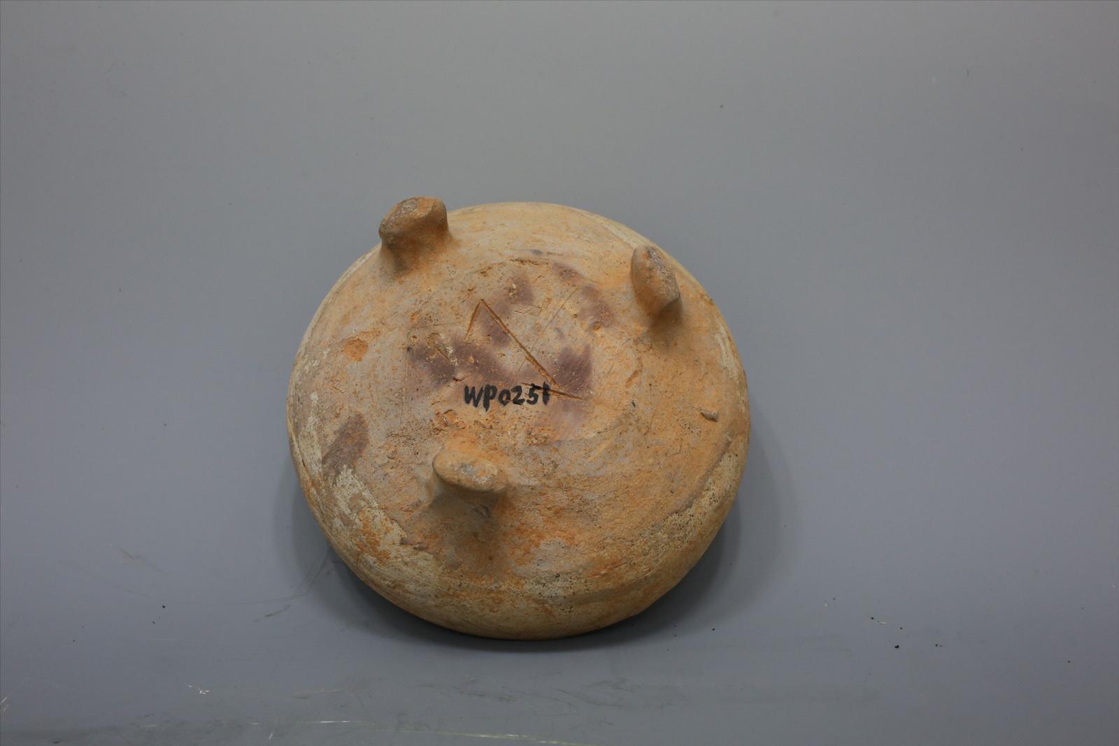 1985年1月,这件三足陶炉在武平县平川镇武平一中后山遗址出土。敛口,圆唇,口径12厘米。折肩,浅直腹,下腹内收,腹径16厘米,腹深5.4厘米。圜底,底部螺旋纹明显,底径6厘米。下附对称三扁足,且足较短,足跟微外撇,足高1.9厘米。夹砂黄陶。通体素面。原本应有上釉,因年代久远已完全脱落。整体器形保存较好。