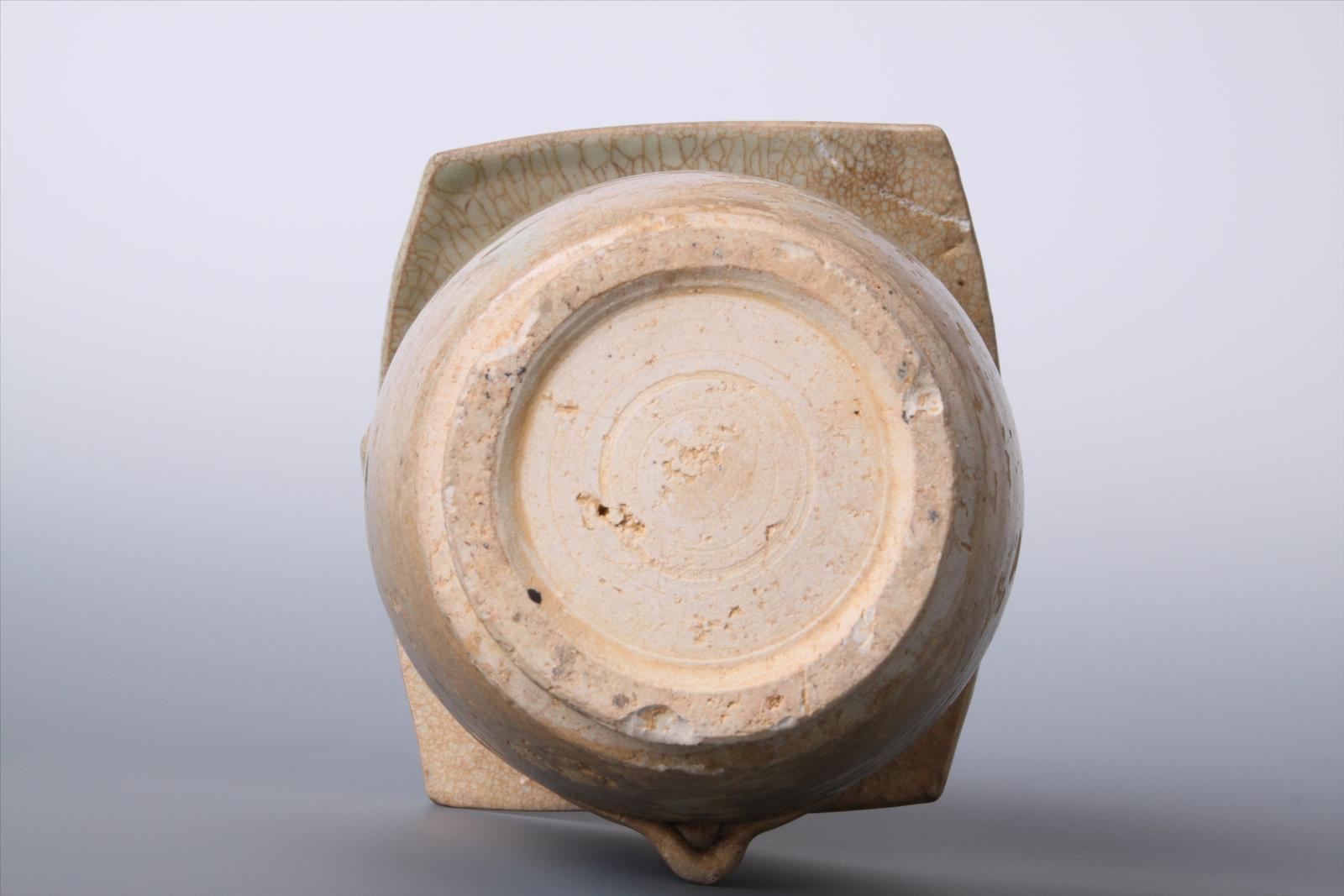 该文物制造于宋代年间,形状特征为翘角悬山谷仓盖,屋脊呈锯齿形,直筒腹,稍弧,正面屋檐下镂25×3.5厘米的仓门,露胎,门上下贴塑,近足突出一崚,通体均施青白秞,开片纹偏黄。圈足浅,底足呈上小下大露胎,高18.9厘米,腹围11.0厘米,底径7.9厘米。