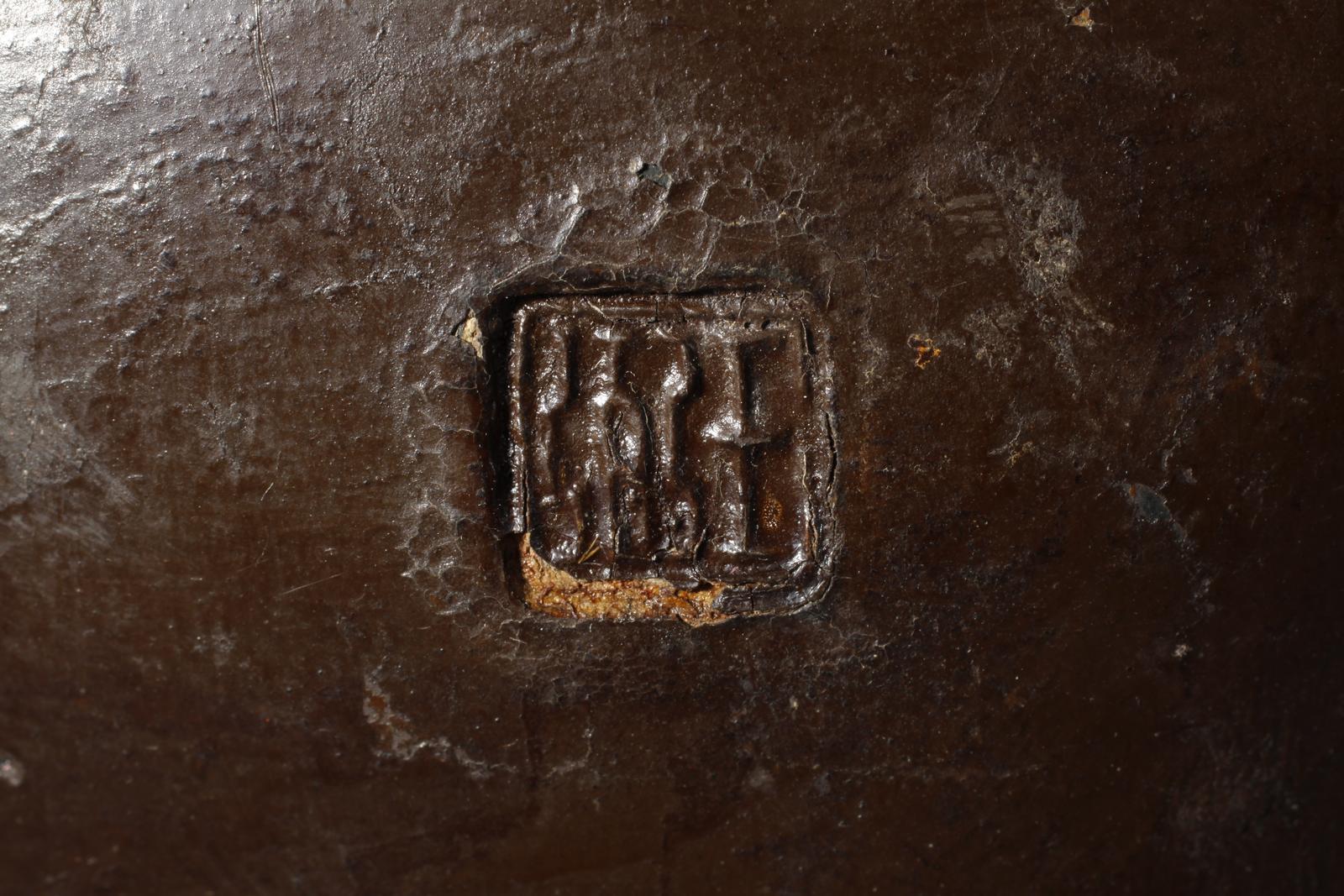 该像高37.1厘米,下摆宽14.5厘米,厚10.5厘米,泥质,通体施酱黑漆,中空。头戴圆帽,帽前面正中嵌有一圆珠。面目慈祥,双目有神,配有稀疏长髯,头部可活动。身着交领长袍,双手合拱于右胸前,腰带雕饰成玉带状,衣褶飘逸自然,线条流畅,比例适中。背部有方形“王弼”印。四脚方形底座,座长17.2,宽13,高4厘米。
