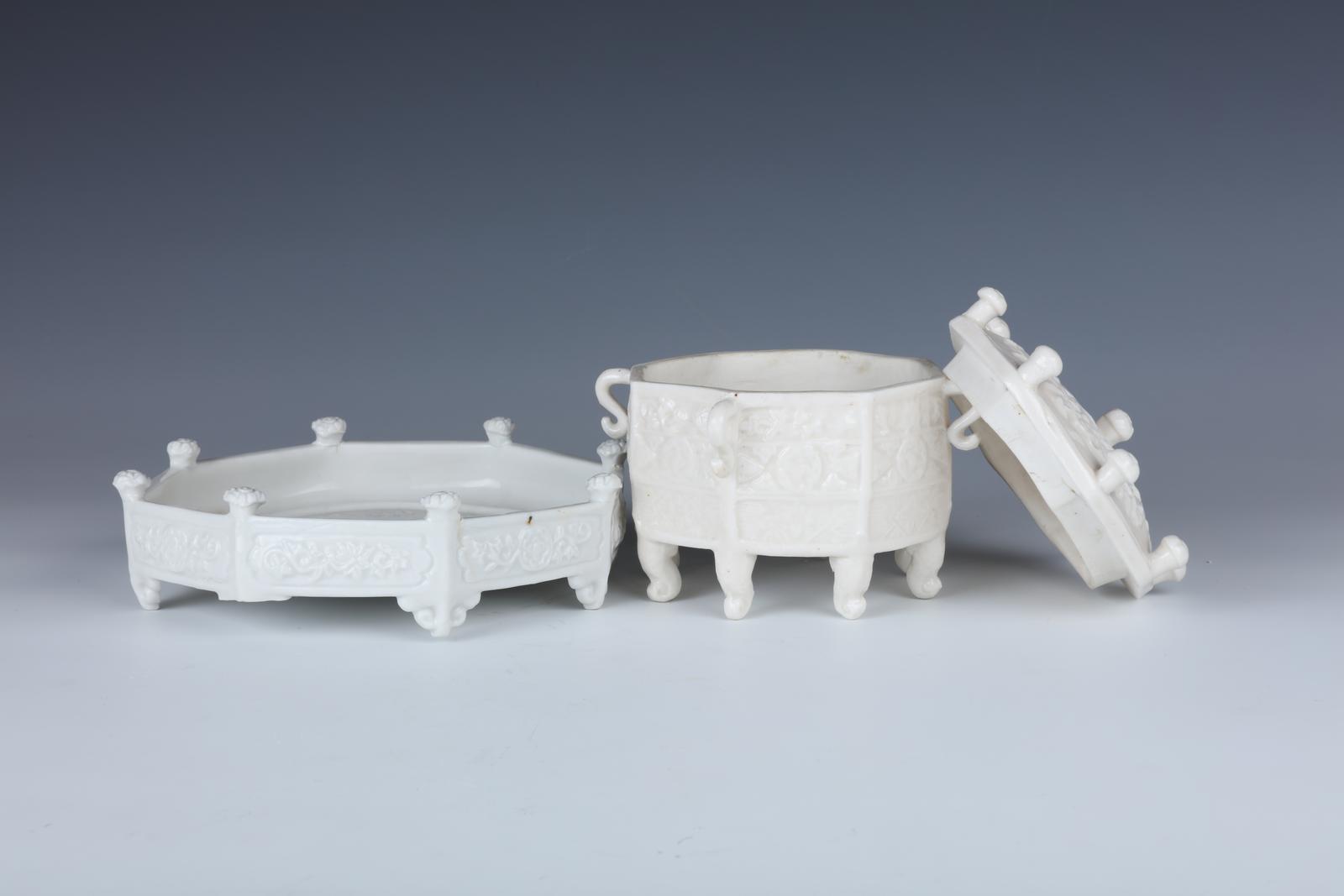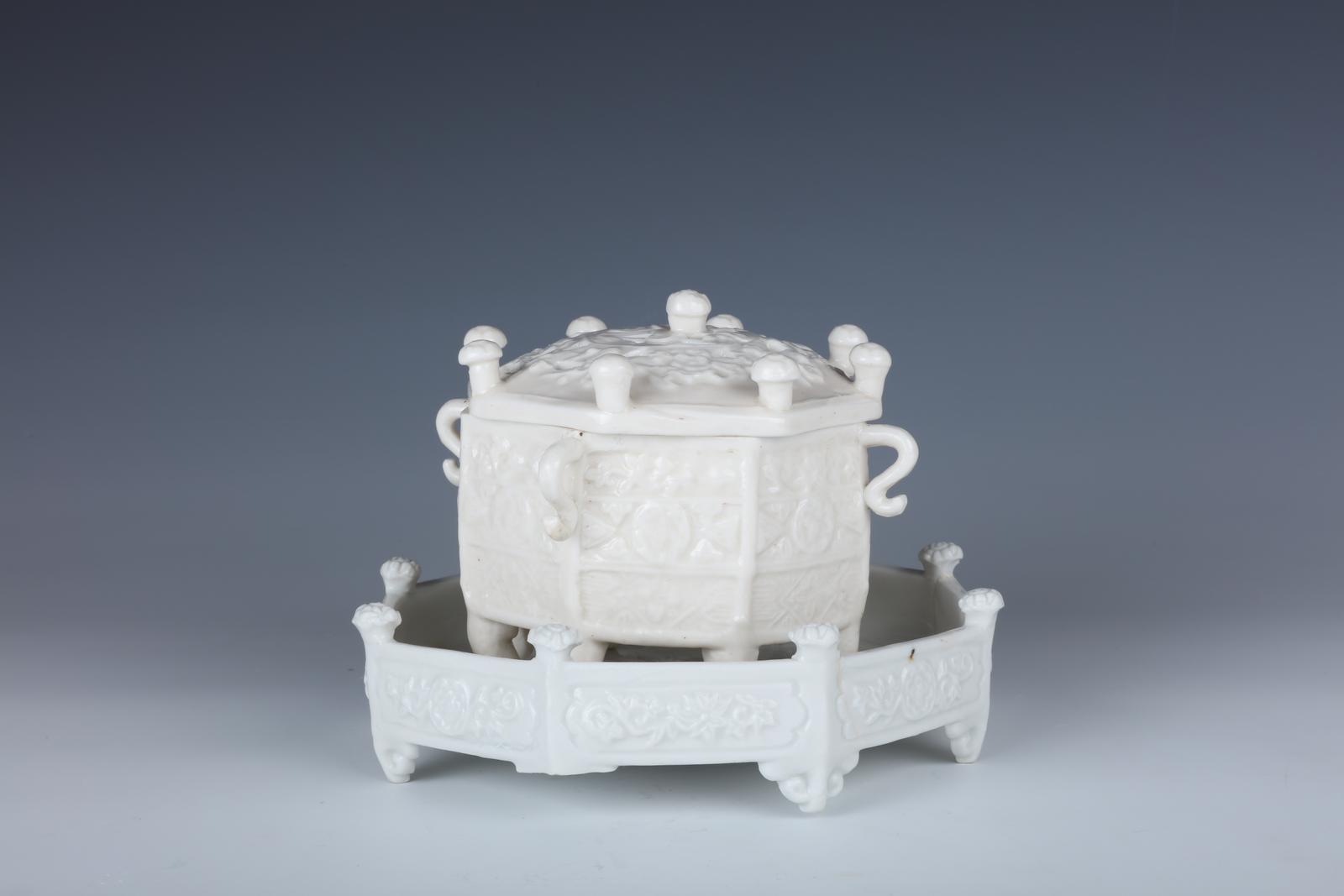 胎白,质坚,细腻,通体施象牙白釉,釉面滋润、莹亮,子母口及底部中央露白胎。器体分三部分组成,器身与器盖作子母口套合,各部件相应呈八角形,器盖中央以一朵团花为主题,镂雕伸展的花卉,口沿沿着相间的棱边分别竖立团花八朵,器身外壁饰“S”形耳四个,足跟相应附八个“S”形足。底座亦作八角形围栏及八朵团花栏杆与器身相呼应,棱边分别饰八个如意纹足。通体满饰锦地繁花纹,线条刻划洒脱自然,造型精美。