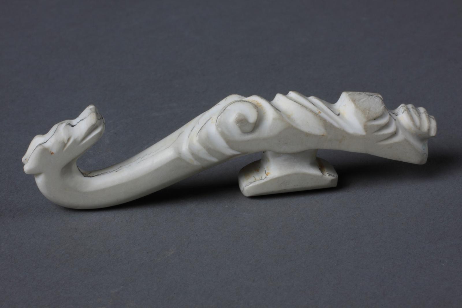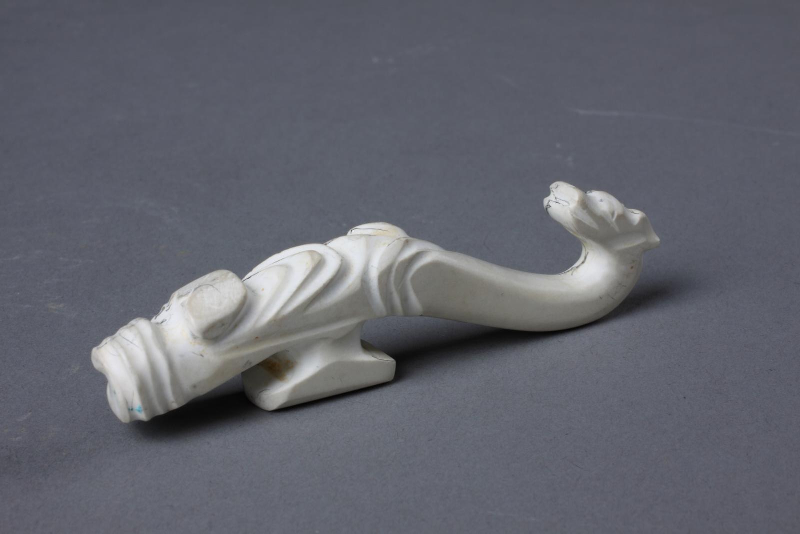 西汉闽越国(公元前202年-公元前110年)玉带钩长7.2厘米, 白色玉质,玉质细腻。整器大致呈龙形,钩首做龙头状,龙嘴、眼、脚栩栩如生。龙身正面及两侧阴刻曲折、卷云纹。下部有倒“T”字形扣钮。