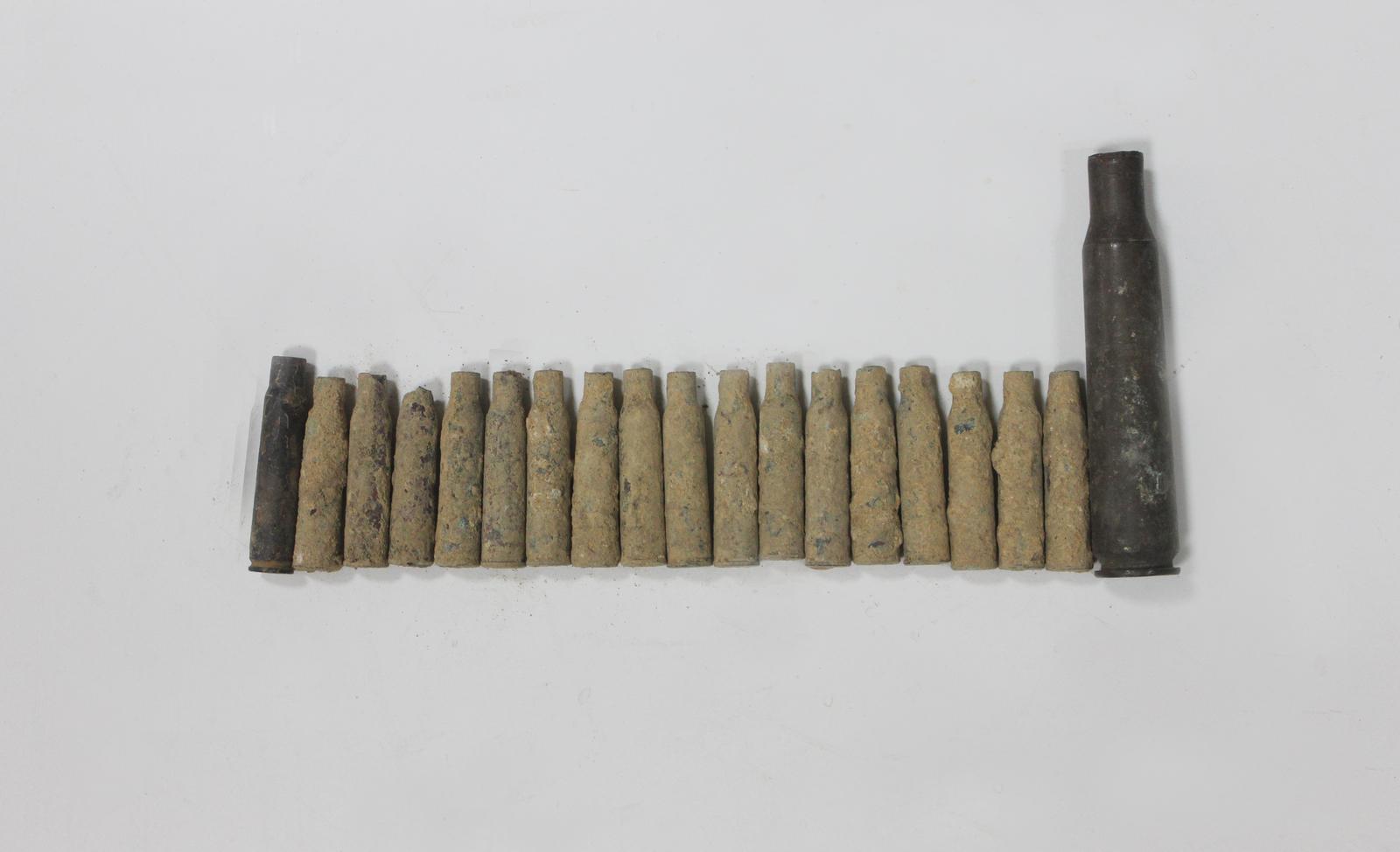 这是中国工农红军东路军攻打漳州时,遗留在南靖十字岭主战场五峰山战壕里的子弹壳(共19粒),步枪子弹壳长5.5厘米,内直径1厘米,机枪子弹壳长10.8厘米,内直径2厘米。收藏在福建省革命历史纪念馆,它见证了这段重要历史,是为数不多在战场遗址上挖掘出来的珍贵实物史料。