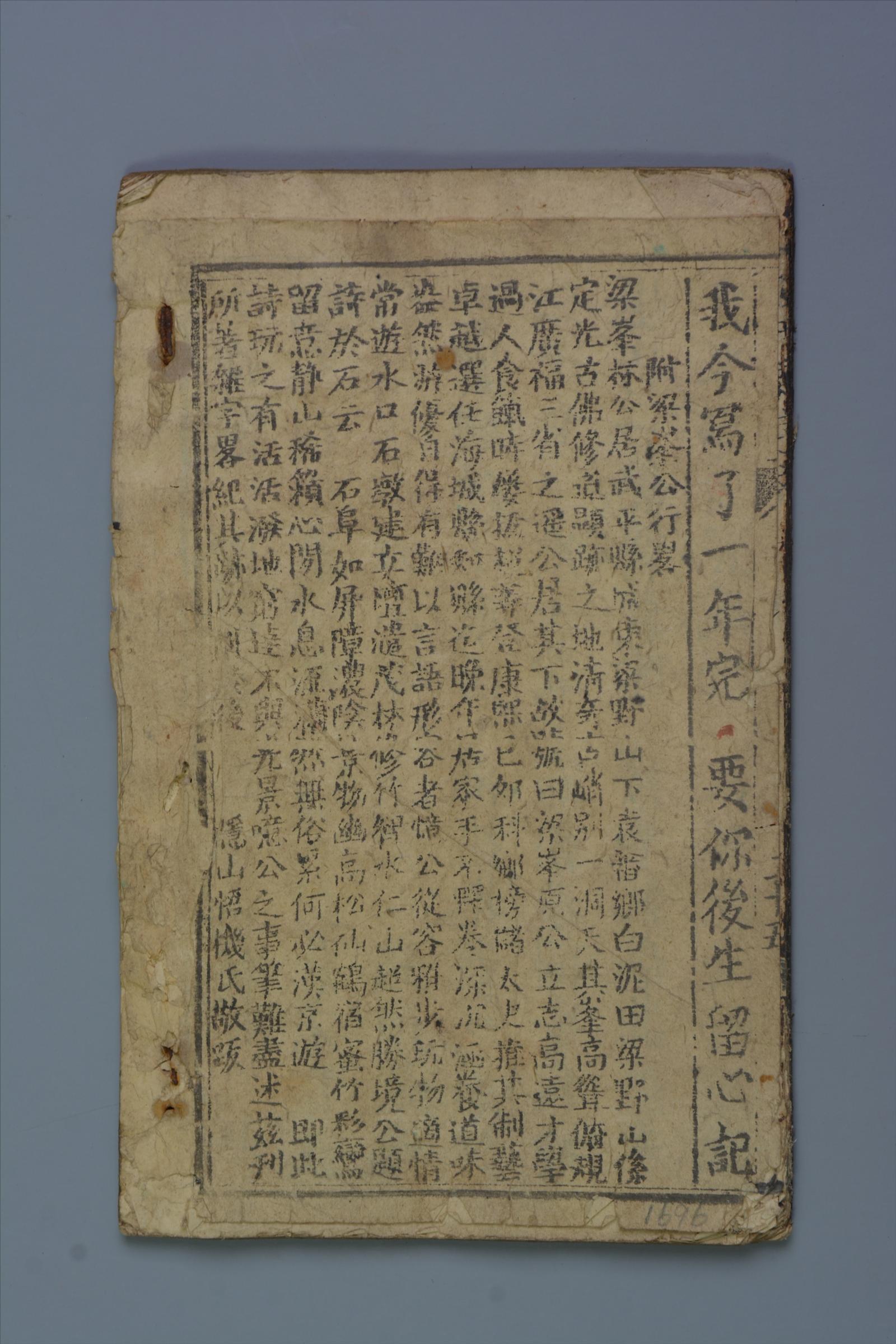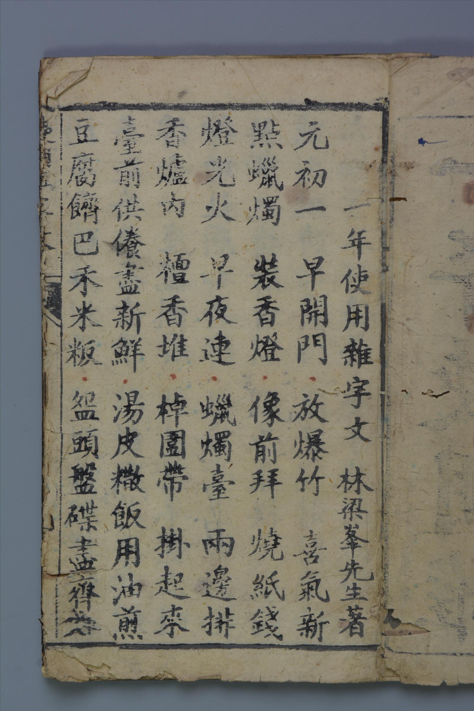 《一年使用杂字文》(俗称《元初一》),长20厘米,宽12.5厘米。全篇共4755字,木刻本。封面封底缺失,内页宣纸。书名页版框内印“一年使用杂字文”,左落“上杭马林蘭藏板”。此书是由康熙年间武平县举人林宝树著。全篇娓娓叙述了客家农村自农历岁首至年末生产生活上的须知事项,涵盖岁时节日、农事安排、民情风俗、婚丧喜庆等内容,文字丰富、通俗易懂、简明实用,是传统社会破蒙识字、居家应用的实用好书。