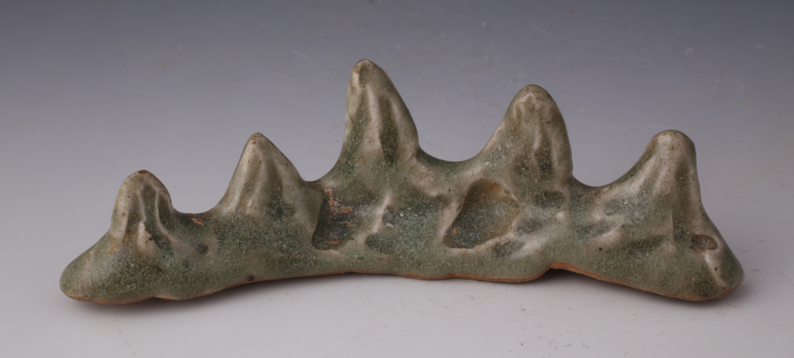 为五峰山状,中峰略高,两侧山峰渐次。施青釉,底无釉。釉呈青绿色,釉质温润,胎灰质细。
