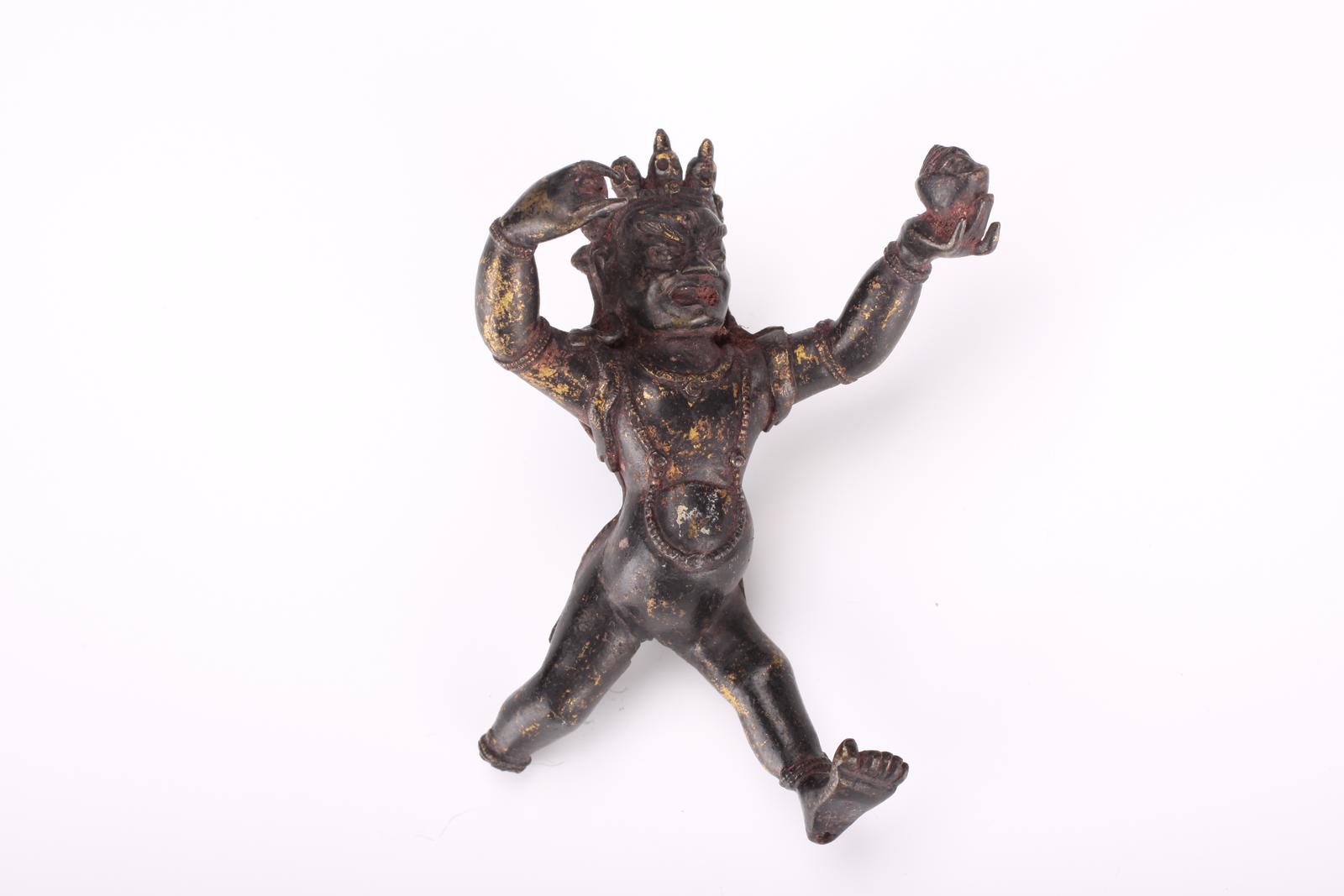 清(公元1644—1911年),宽7厘米,通高10厘米,头戴佛冠,张口,一手上伸持元宝,一手长屈扶冠,跨步状,造型夸张。