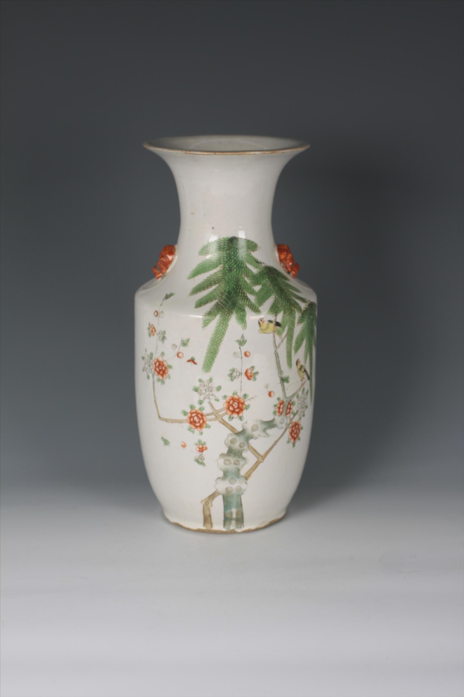 该藏品正面粉彩绘花鸟纹饰。翠绿的芭蕉叶下,花枝悄然伸出,花朵怒放;两只小鸟休憩在枝头,姿态各一。整个画面气氛祥和,绘工精美,色彩明丽。瓷瓶背面行书“明意林中频噪噪,武生飘磊乐无穷”律诗。