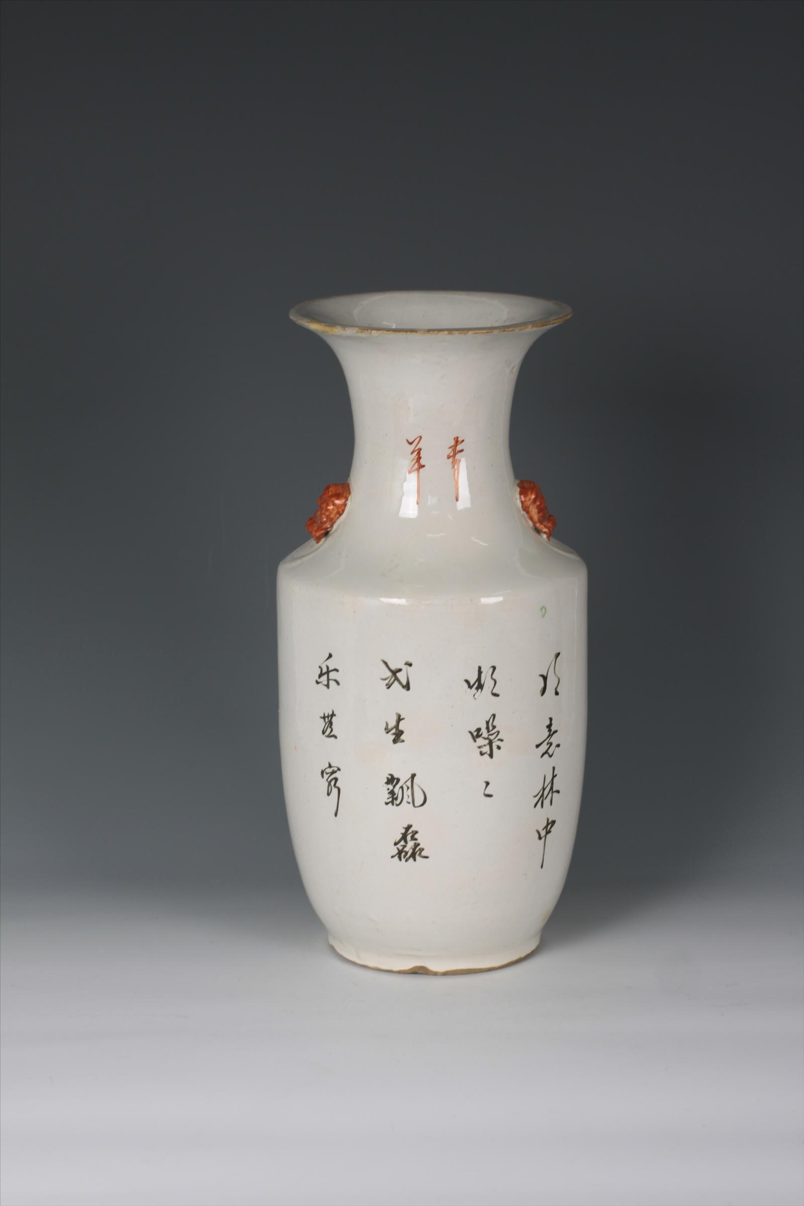 这是上杭县博物馆藏民国彩绘花卉纹双耳棒槌瓶。口径17.5cm,底径13.7cm,重4.031kg。瓶盘口,长颈,溜肩,长圆腹,圈足,瓶内外通体施白釉。瓶身颈部两侧对称置瓶耳,中间篆有“吉羊”两字。羊,即祥也,古人把羊与祥通用,吉羊即为吉祥。