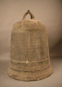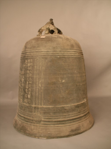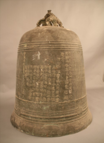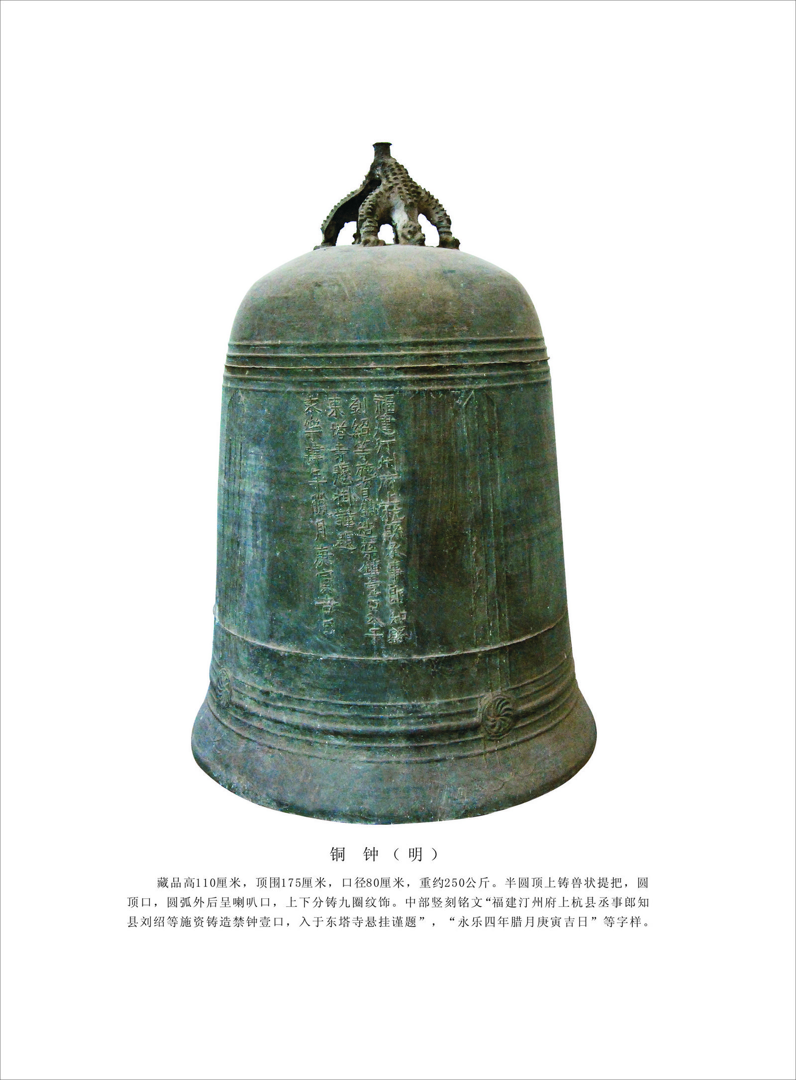 明代,高110厘米,腹围199厘米,口径80厘米,重250千克,敞口,青灰色铜质,圆顶上铸蒲牢提把,圆顶至底,沿口呈喇叭形,上下分铸九圈线状纹饰,并铸有竖式铭文“福建汀州府上杭县承事郎知县刘绍等施资铸造禁钟壹口,入于东塔寺悬挂谨题,永乐四年腊月庚寅吉日”。
