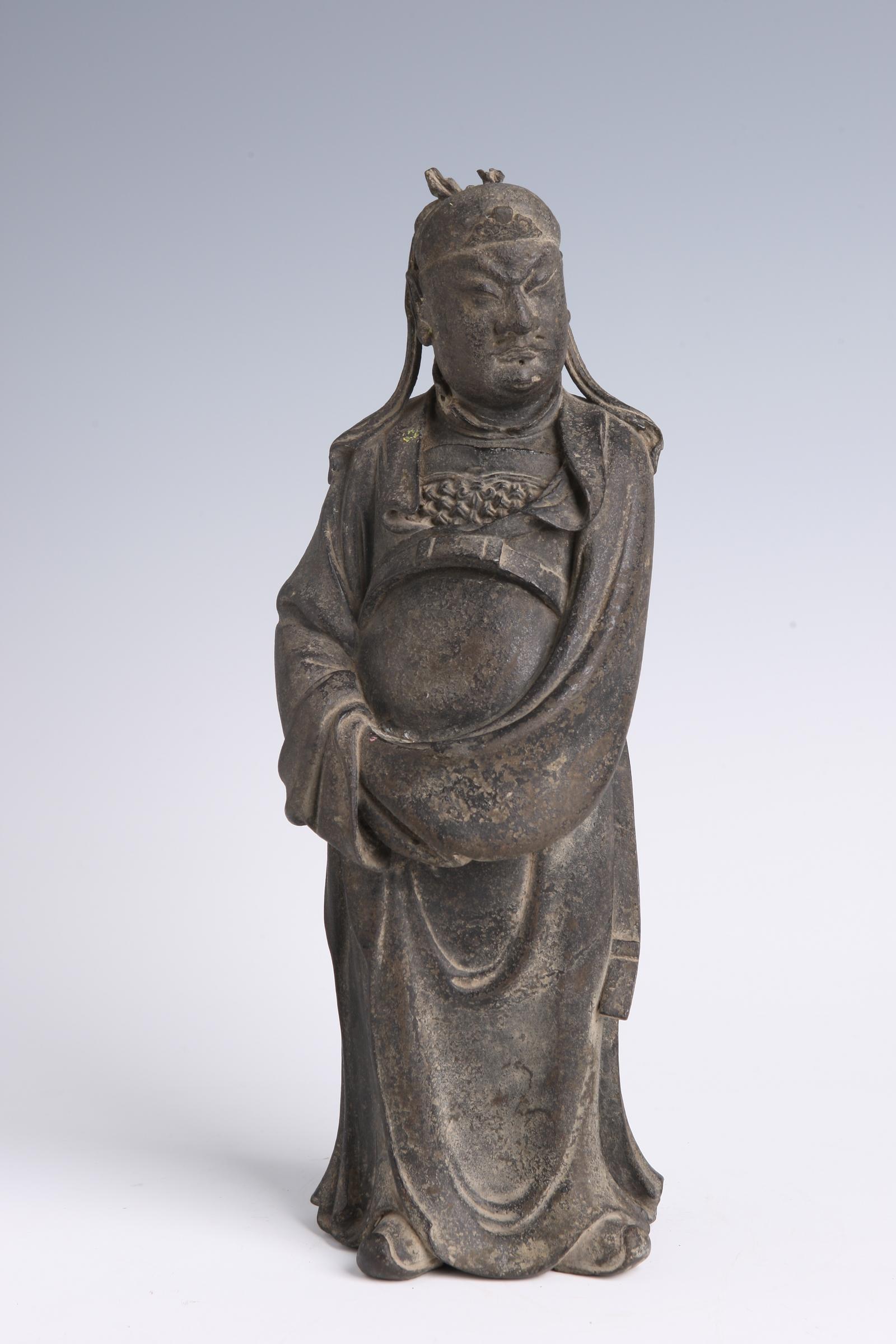 清关公铜立像,高35.2厘米,宽11.7厘米,腹围31厘米,关公头戴巾帻,飘带垂于肩,阔脸卧蚕眉,丹凤眼,高鼻。外穿长袍,内穿盔甲,胸前露鱼鳞纹盔甲,戴腰箍,双手隐于袖内做拱之势,拢于腰右侧,侧首站立。