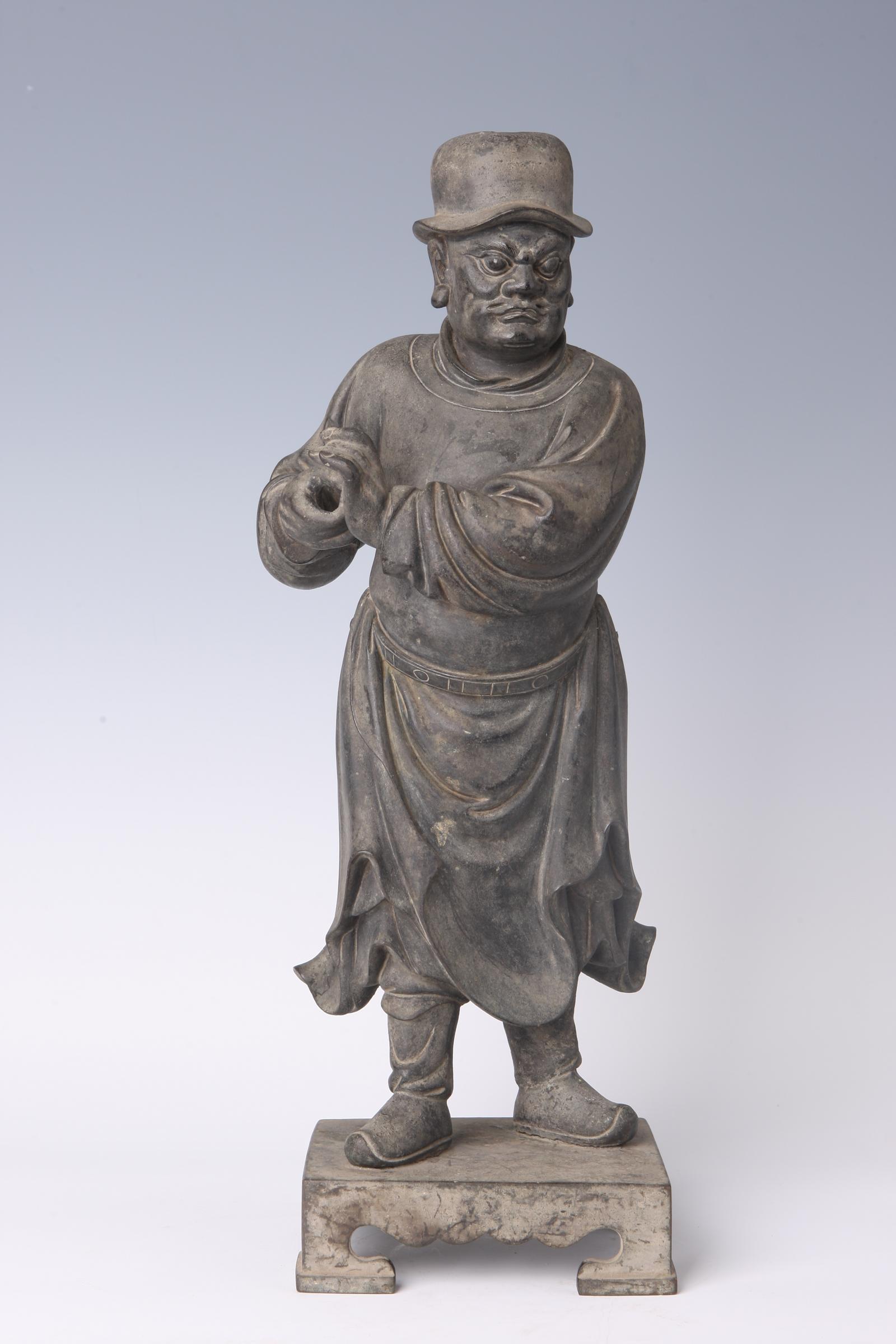 清周仓铜立像,通高42.4厘米,宽16.6厘米,底座长15厘米,宽12.2厘米,腹围31.2厘米。周仓头戴曲檐高帽,大耳阔脸,铜铃眼,双唇紧闭,神态威严,身穿团领官袍,腰束玉带,脚穿长统靴,左手搭于右手上,放于胸右侧,侧立于四足方形座上。