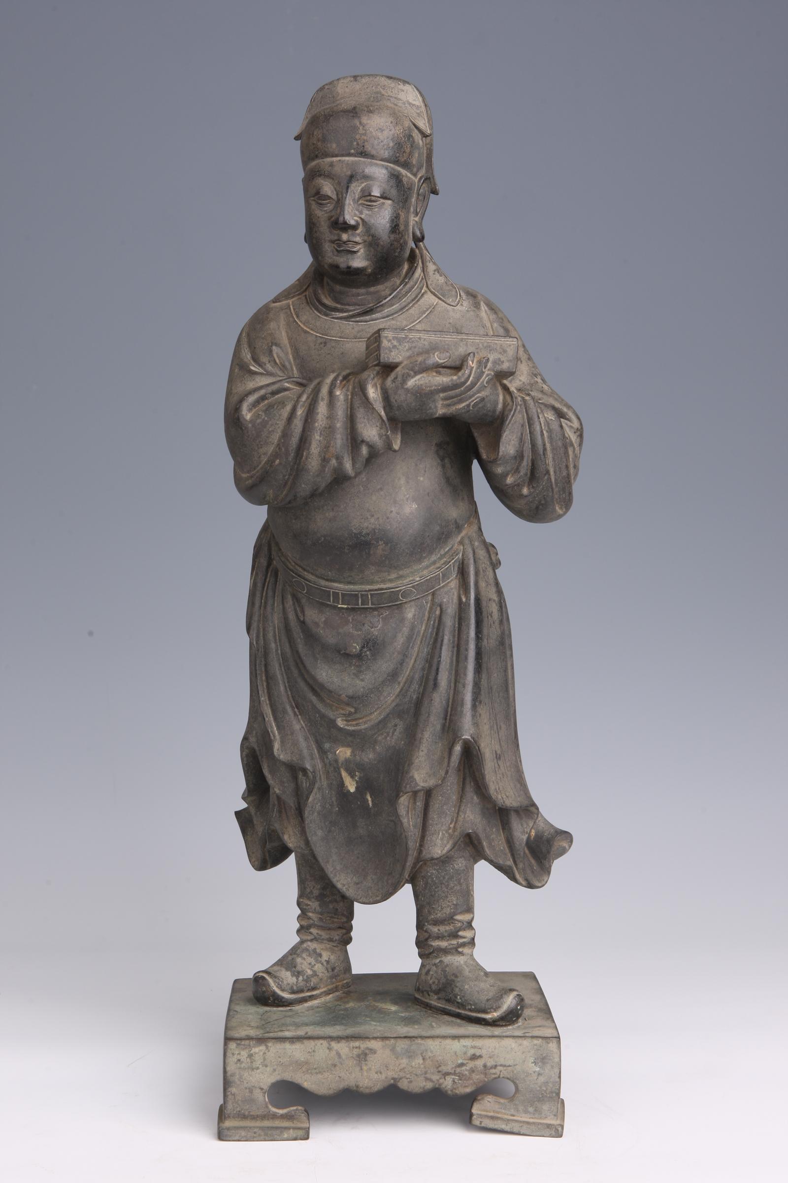 清关平铜立像,通高43.2厘米,宽17.6厘米,底座长15厘米,宽12.4厘米,高4.5厘米,腹围31厘米,关平铜立像关平头戴巾帻,飘带垂肩,身穿团领官袍,腰束玉带,双手托《春秋》,脚穿长统靴,侧立于四足方形座上。
