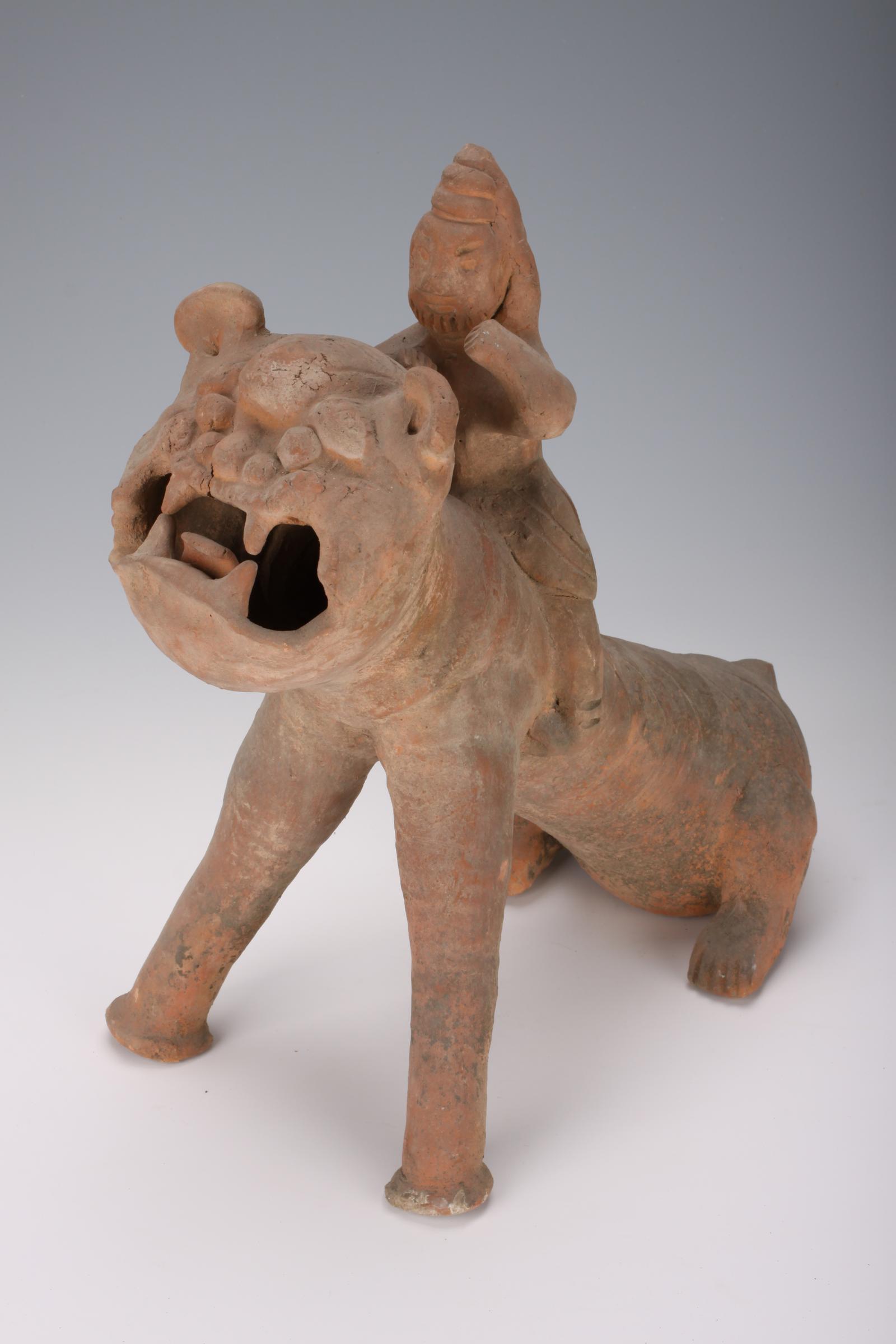 清(公元1644—1911年),通高36.5厘米,长33厘米,器身呈圆筒形蹲状。狮子张口呲牙,人物骑狮北颈,收螺髻戴风帽,呲牙咧嘴。