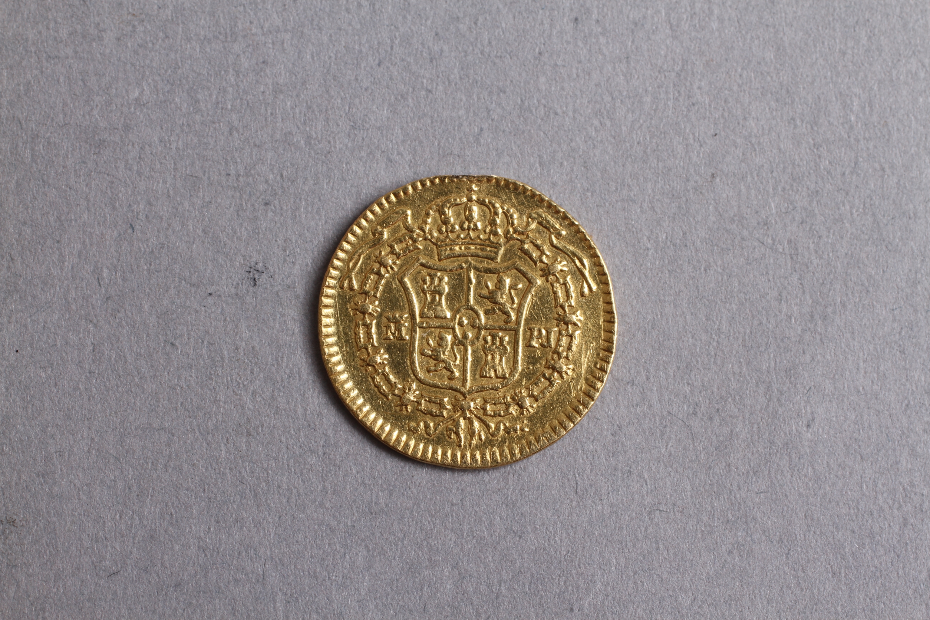 此枚钱币制成于公元1772年。金质币,正洛斯三世侧脸头像,背皇冠盾微组合章,皆有文字环绕。卡洛斯三世(Carlos III;英语文献中常写作:查理三世 Charles III;公元1716年1月20日至公元1788年12月14日),波旁王朝的西班牙国王(公元1759-公元1788年在位),即位前封号为帕尔马公爵(称卡洛斯一世,公元1731-公元1735年)。他也是那不勒斯国王(称卡洛七世,公元1735-公元1759年)和西西里国王(称卡洛四世,公元1735-公元1759年)。