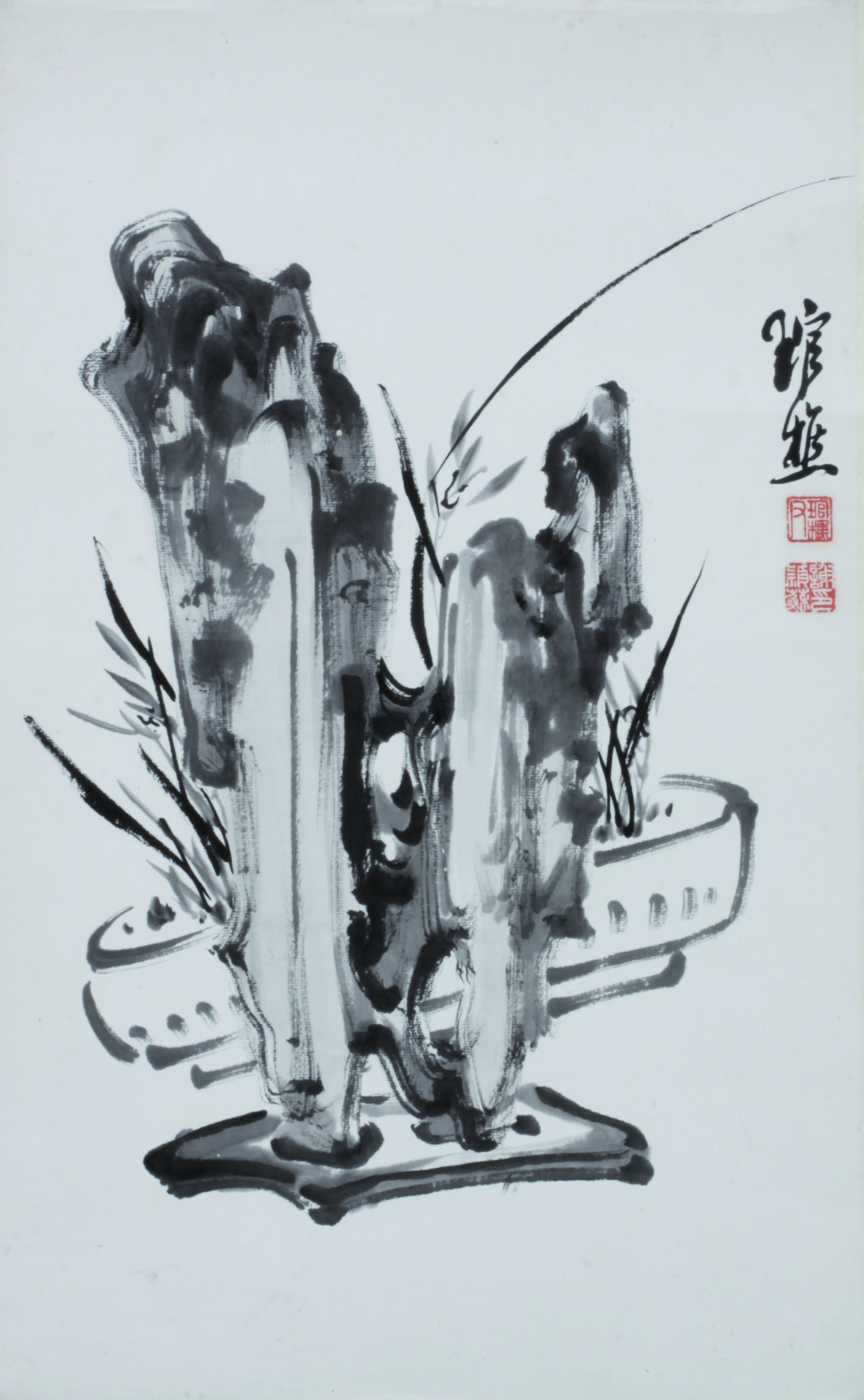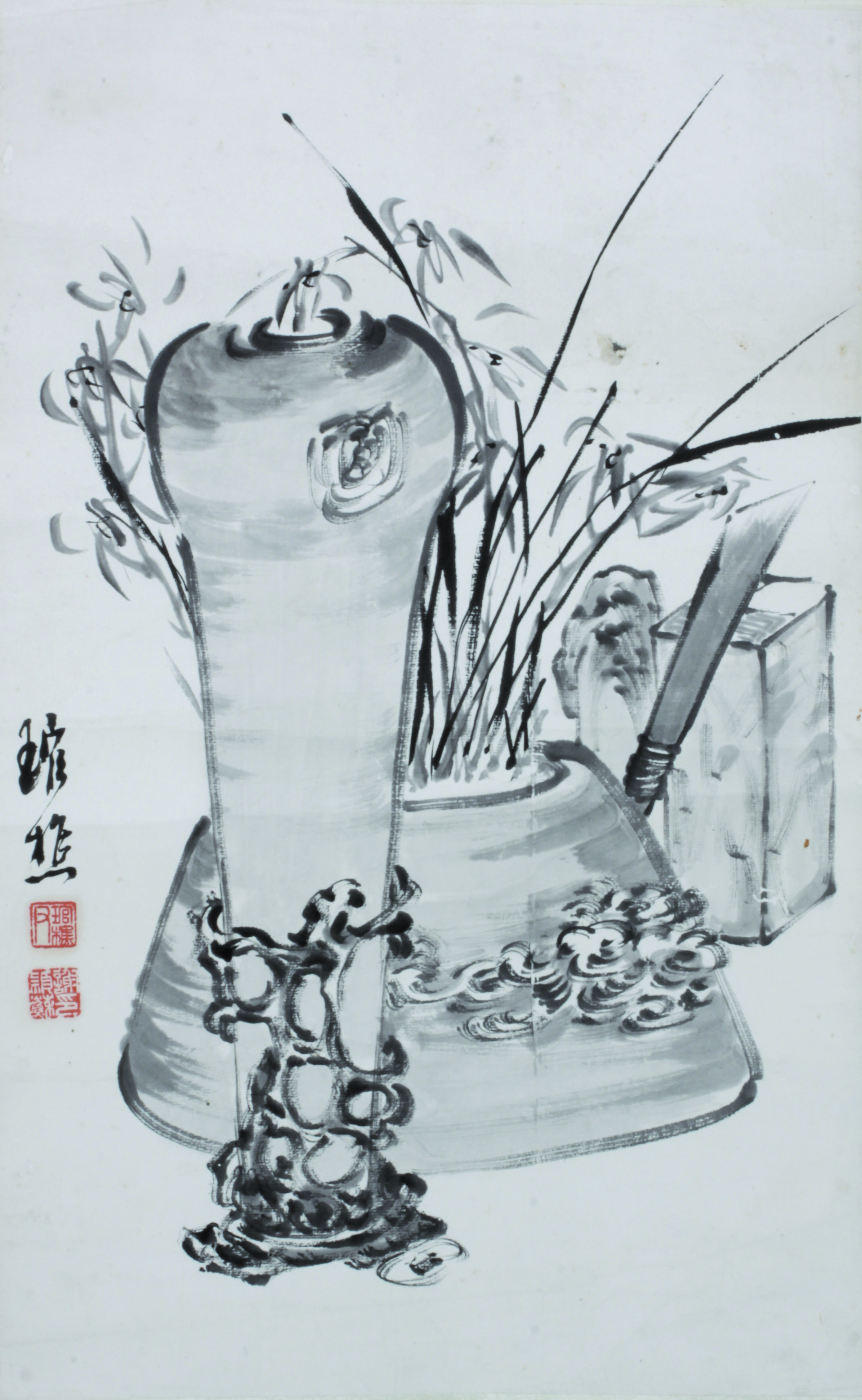 此册页共四幅,纸本,纵47厘米,横30厘米,现藏于厦门市博物馆。第一幅画的是一尊一缶,一刀一石,缶上丛兰。单款“琯樵”,钤印:“琯樵父”,朱文;“谢颖苏印”,白文。