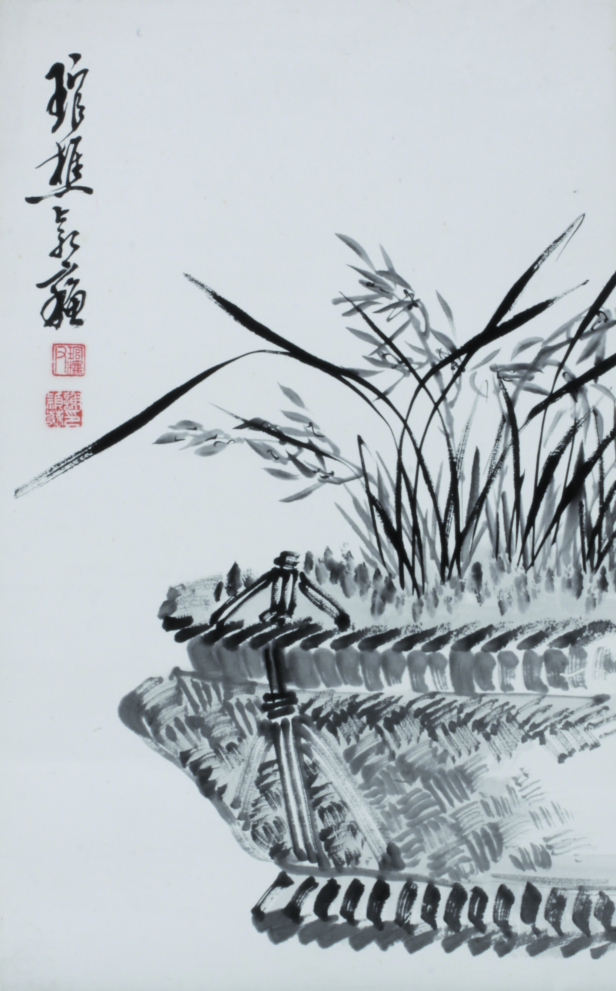第二幅画的是一桶一箕,一丛小兰。题款“幽兰空谷,琯樵”。钤印:“琯樵父”,朱文;“谢颖苏印”,白文。