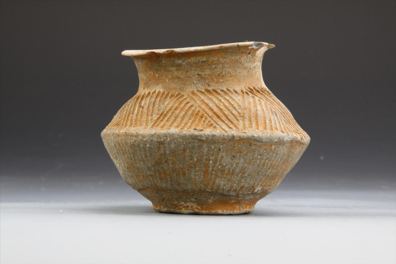 卷沿,短直颈,斜肩折腹,矮饼足,肩部刻划斜线三角纹,腹部刻划条纹,灰色硬陶。