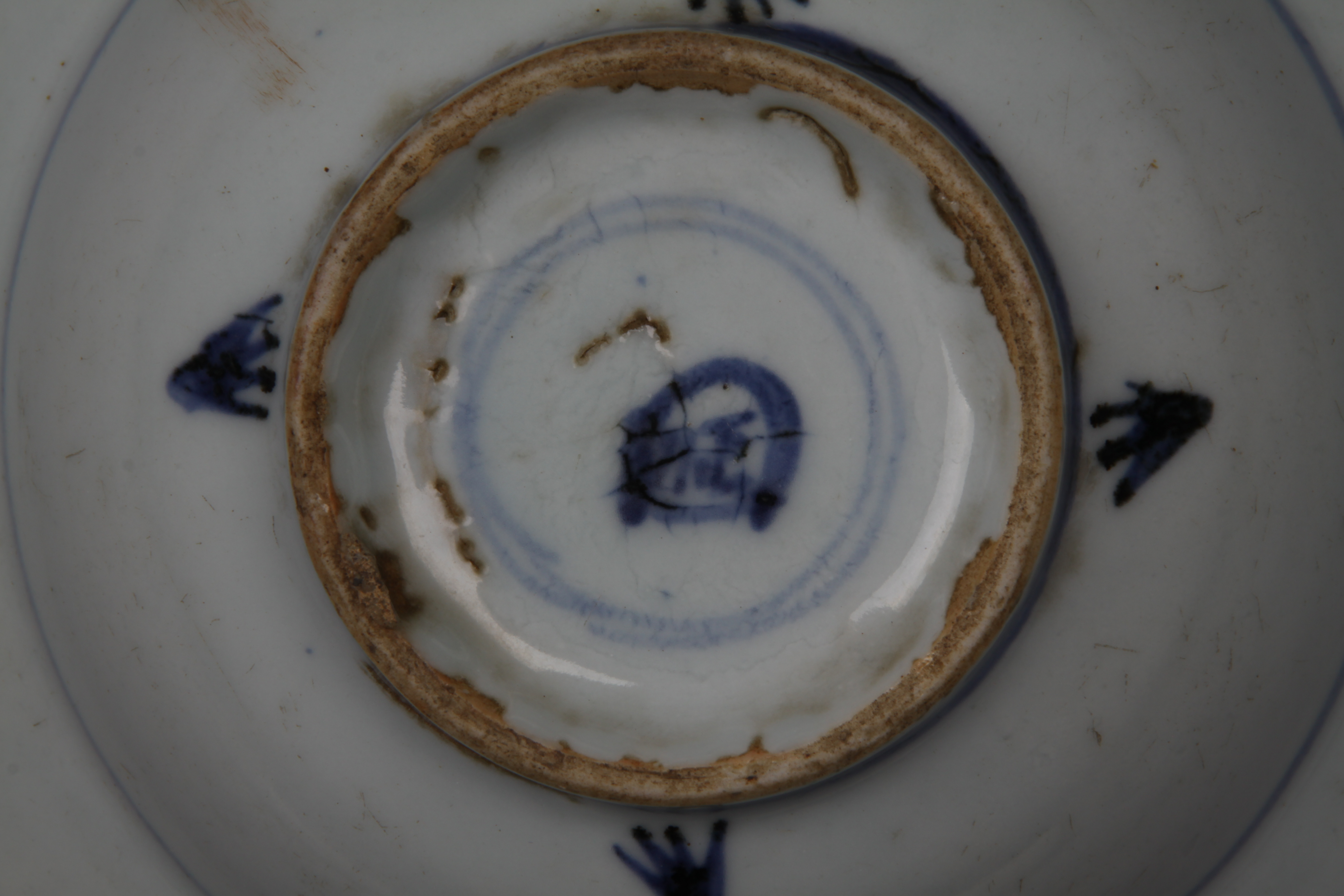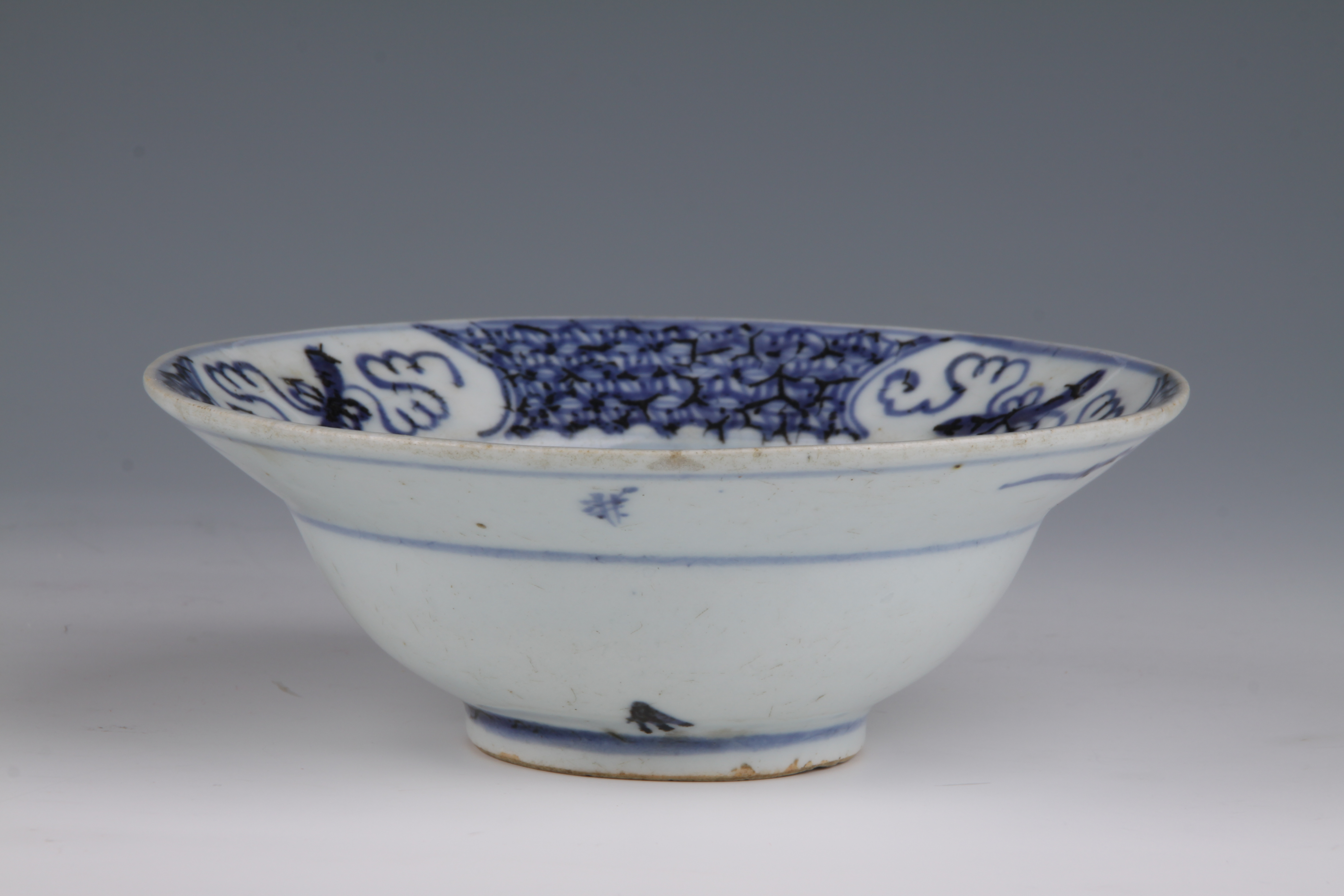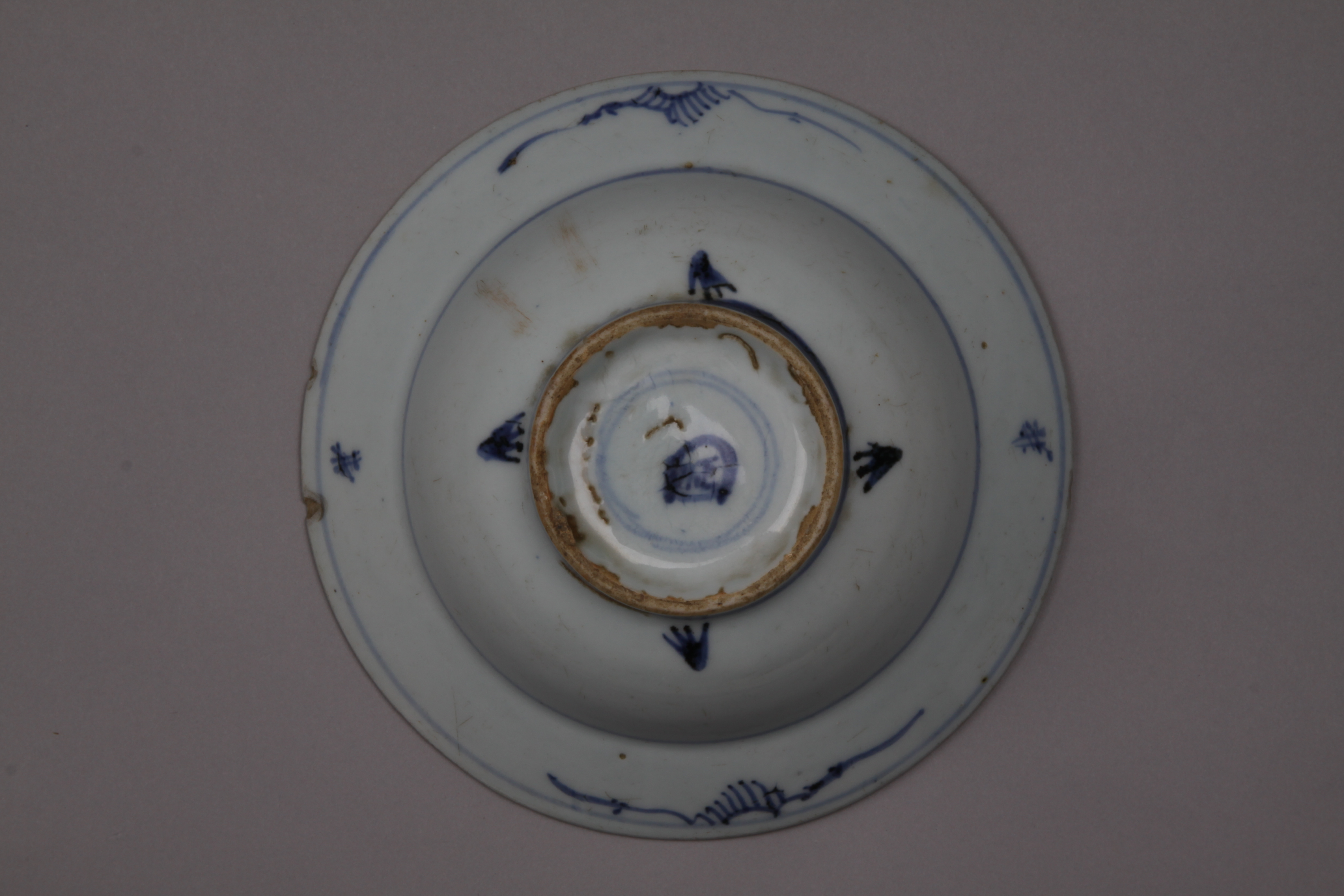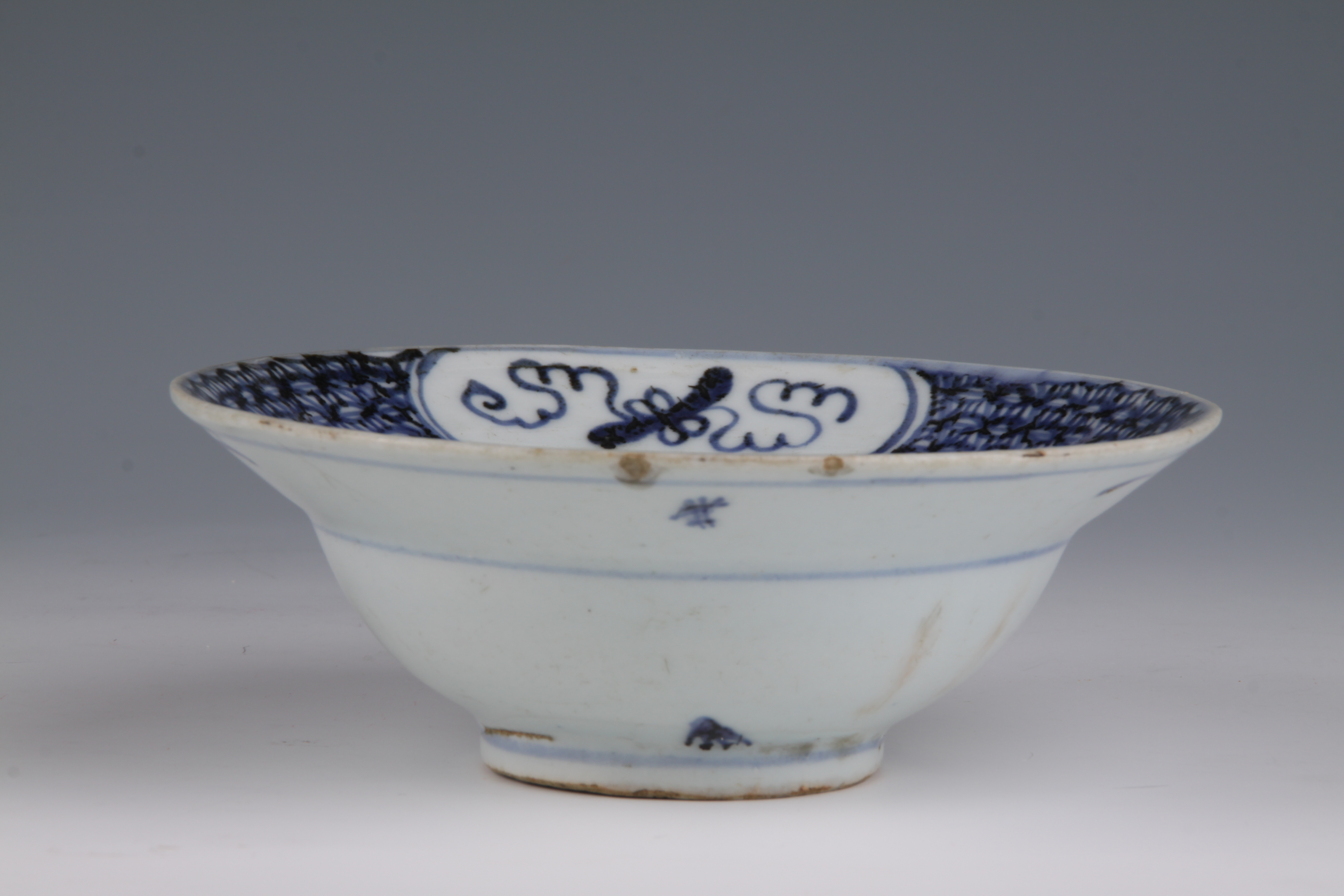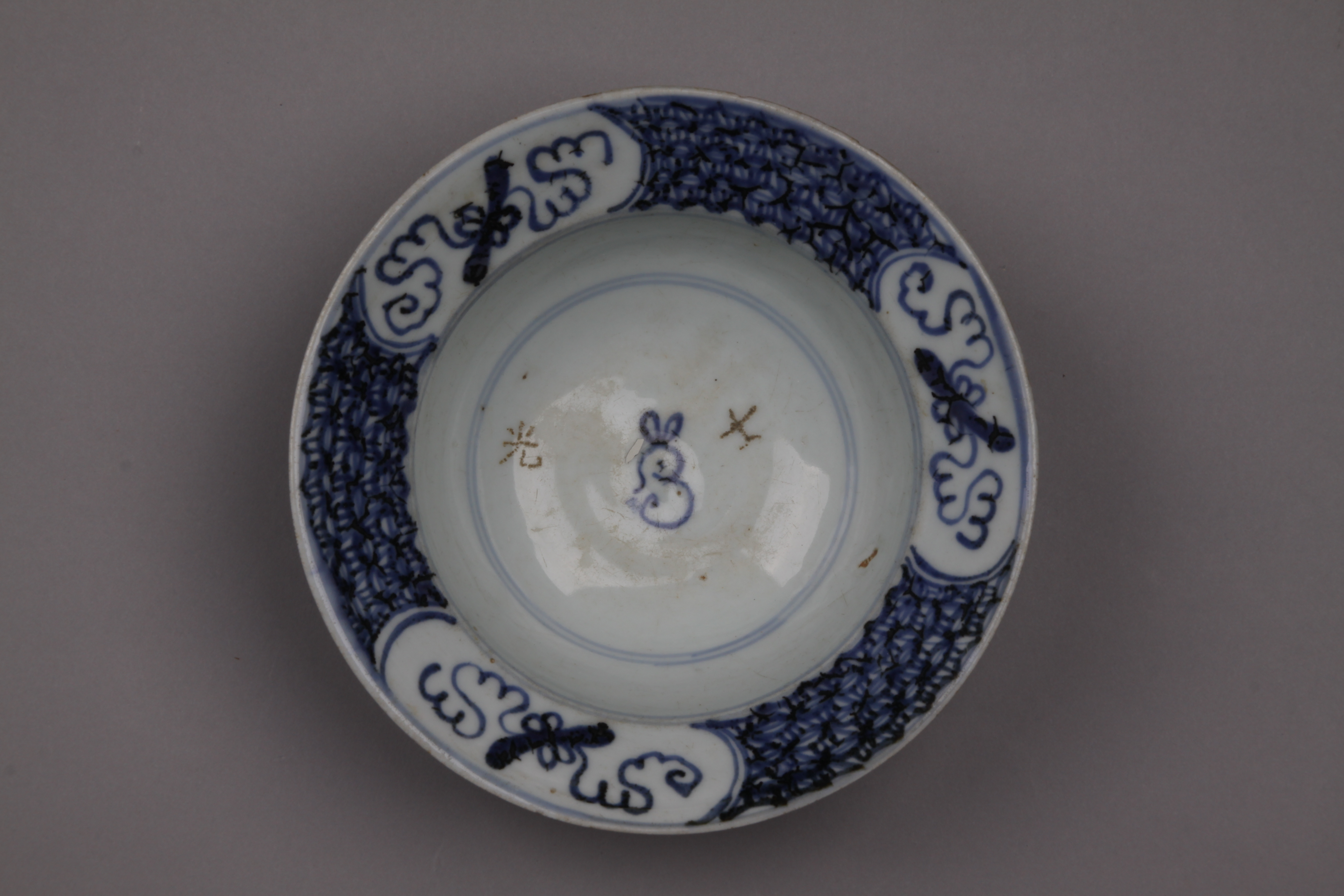 清青花绶带兔纹瓷碗,口径17.0厘米,腹径11.7厘米,底径6.6厘米,高6.7厘米,重294克。圆唇,敞口,上腹内折,下弧腹内收,矮圈足,施白釉。碗外壁以青花勾勒几笔装饰,纹饰简洁。内口沿绘锦地三开光绶带纹,内底有两个记号文字“光”和“士”,内底心绘一青花兔纹,兔纹做回首竖耳状,寥寥几笔,神态生动,整个纹饰充溢着浓郁的生活气息。