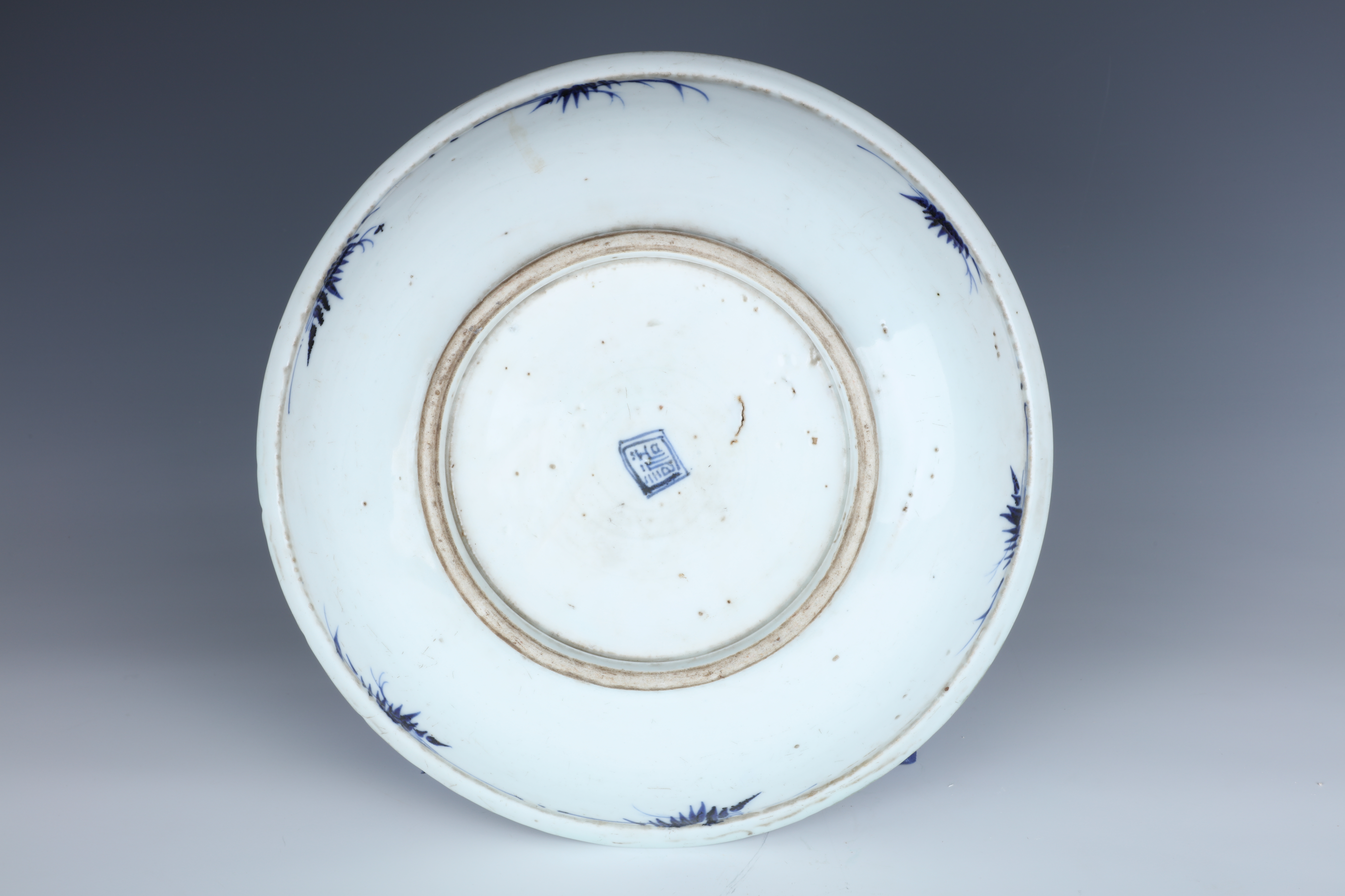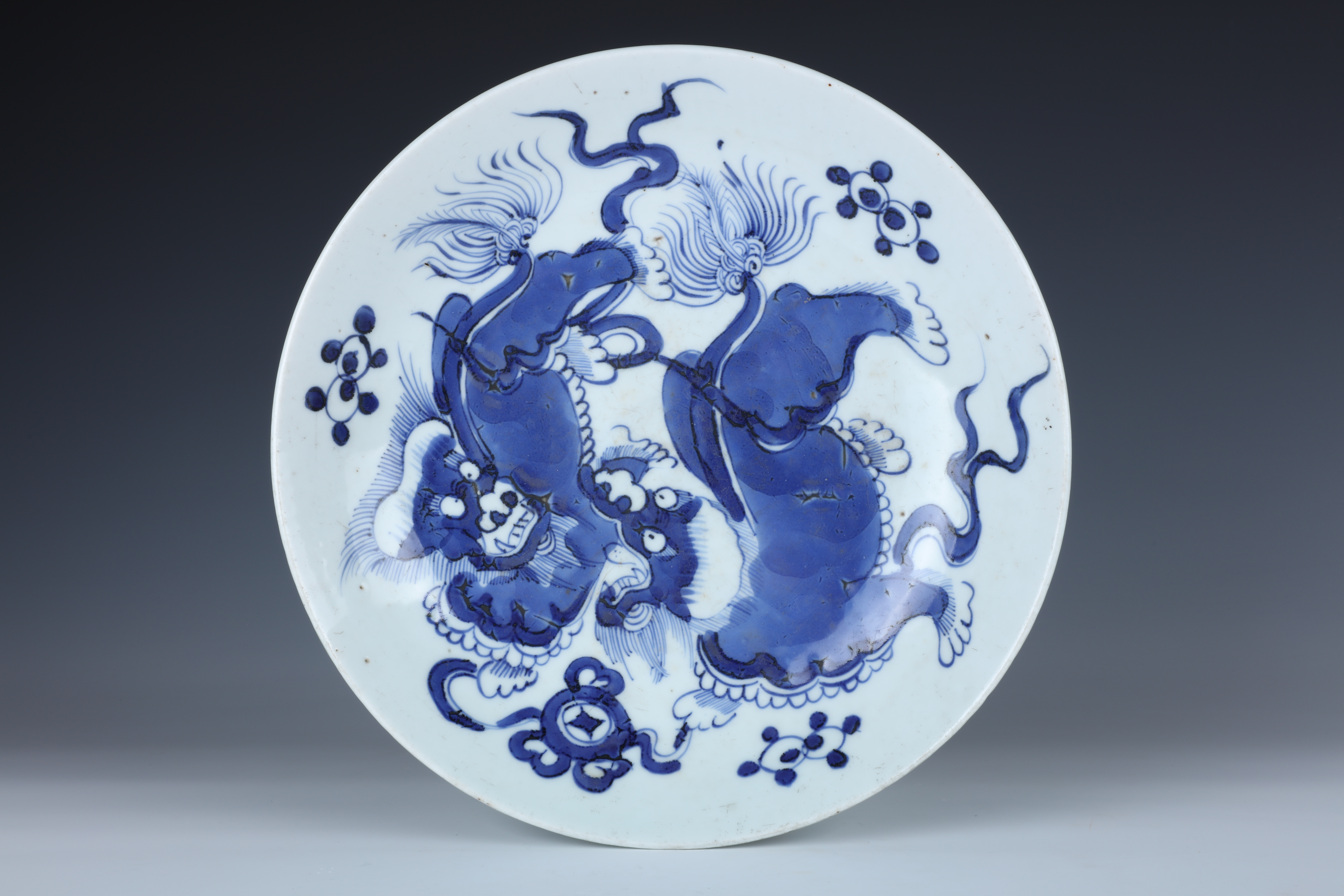 白胎白釉泛黄,釉色匀净,莹润露胎。收口,浅平底,圈足,盘内措绘有双狮戏球图案,狮子长脸,身体健硕,互相呼应,笔触有力,画工精细,富有民俗色彩,是民间喜闻乐见的题材。盘外壁绘有三组竹枝。青花发色较翠兰,富有层次。