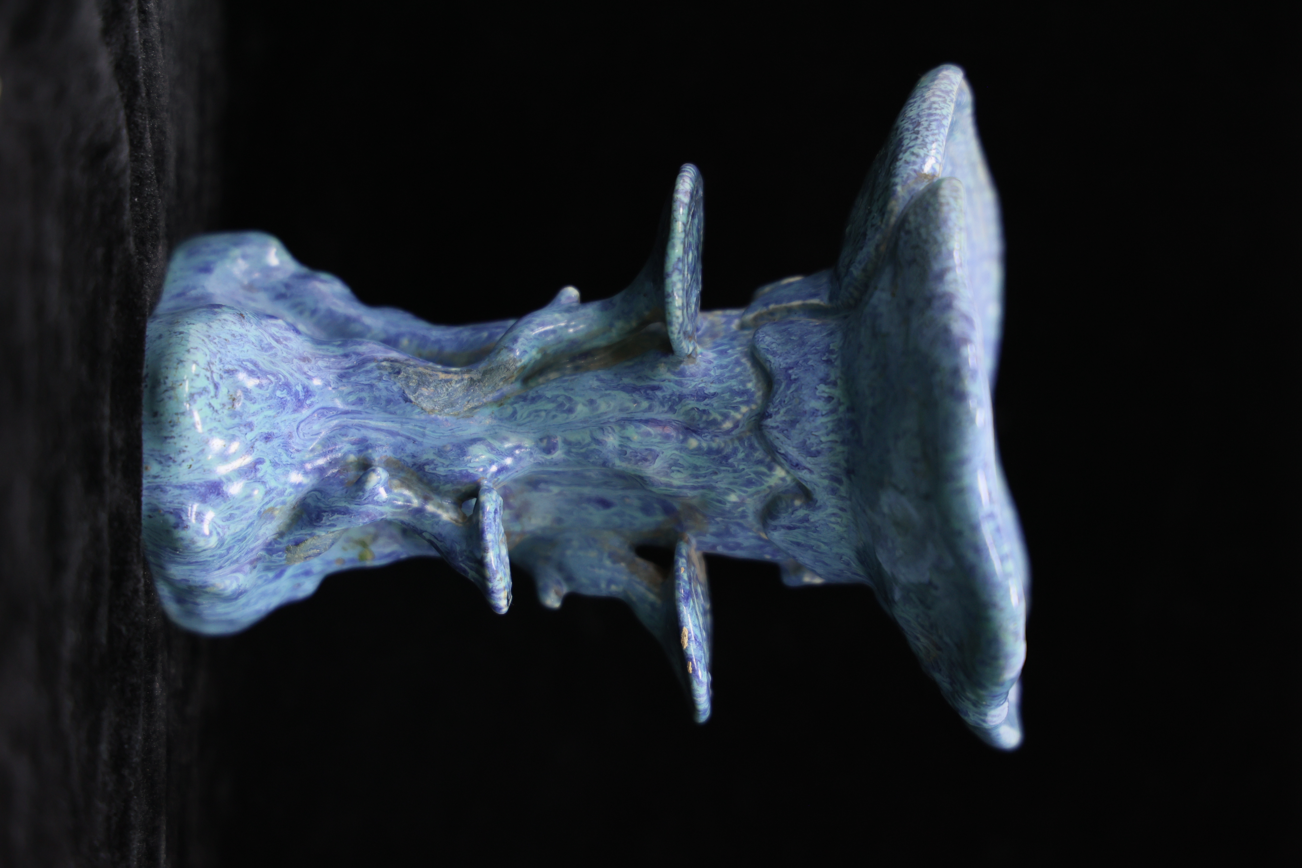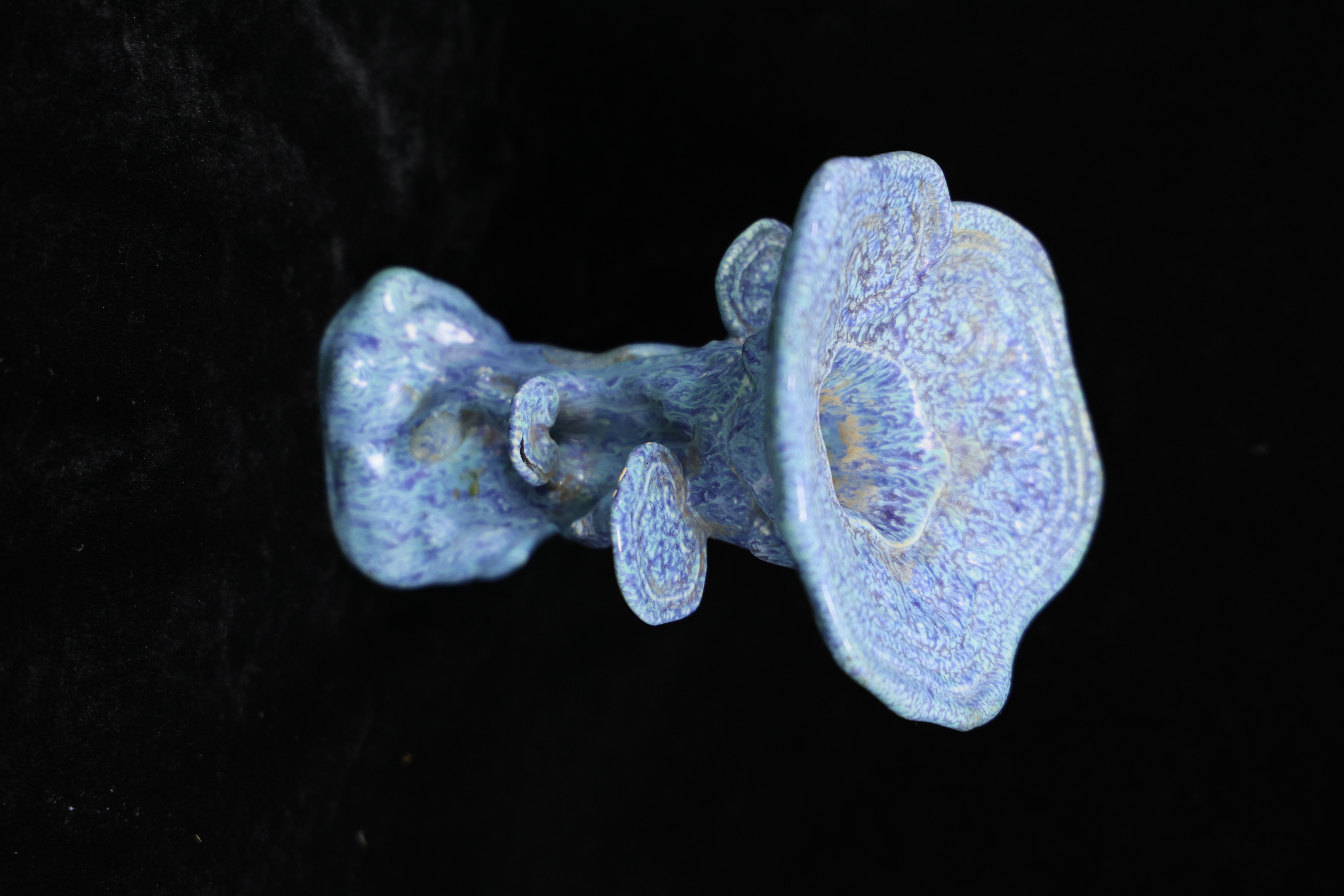 简 介:口径12.6cm底径8cm高15.2cm。此器为乾隆御制象生瓷代表,构思巧妙别致,取千年灵芝为形,菌盖厚实,茁健苍雅,表面环沟散布,质感如真,柄根粗壮,萌出大小各异的灵芝,通体施饰炉钧釉,随形而下,光泽温润,釉中诸色浑融交错,尽显典雅清幽之态。其内中空,可供插花,一器二用,既可把玩,亦可清供。