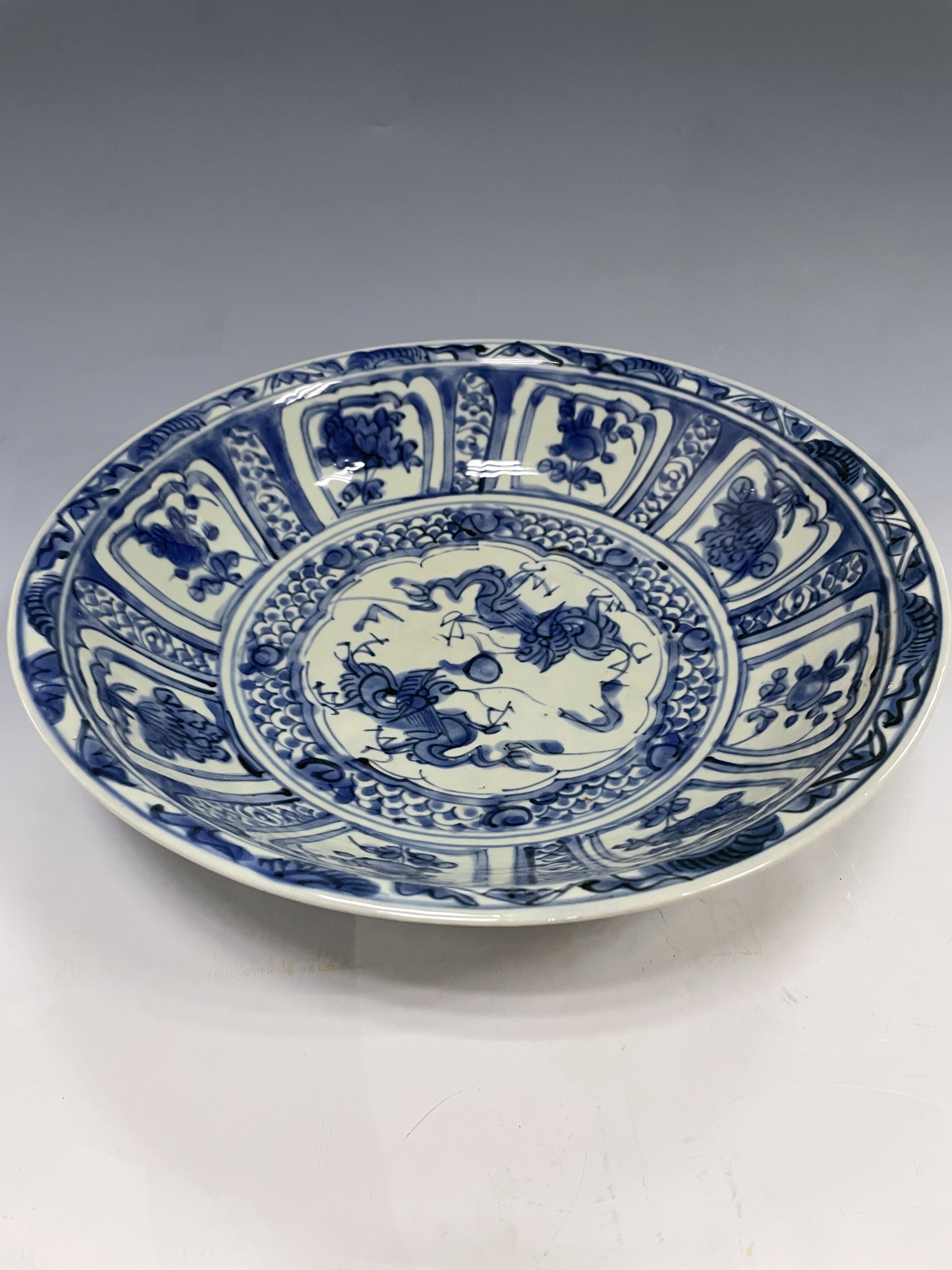 该大盘口径38.5厘米,足径19厘米,高10厘米。圆唇,敞口,折沿,深弧腹,矮圈足,灰白胎,足内底未施满釉,足底粘砂。内口沿上绘有青花花草纹,内腹部绘八开光花卉图案,器心为青花弦纹内绘双龙戏珠卷云纹。外壁口沿下绘有一道青花弦纹,腹部绘有绶带纹。