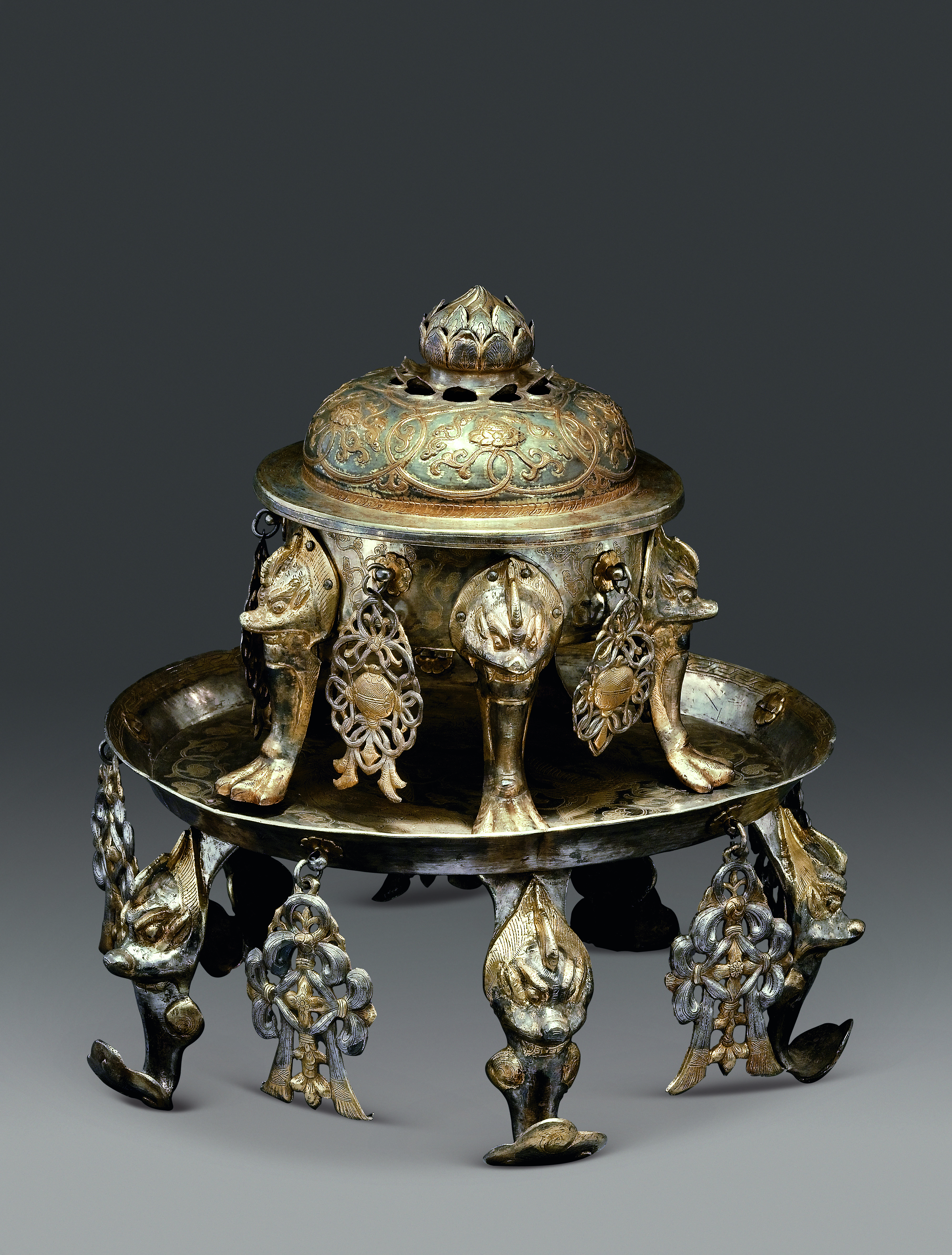 法门寺博物馆·鎏金卧龟莲花纹五足朵带银香炉