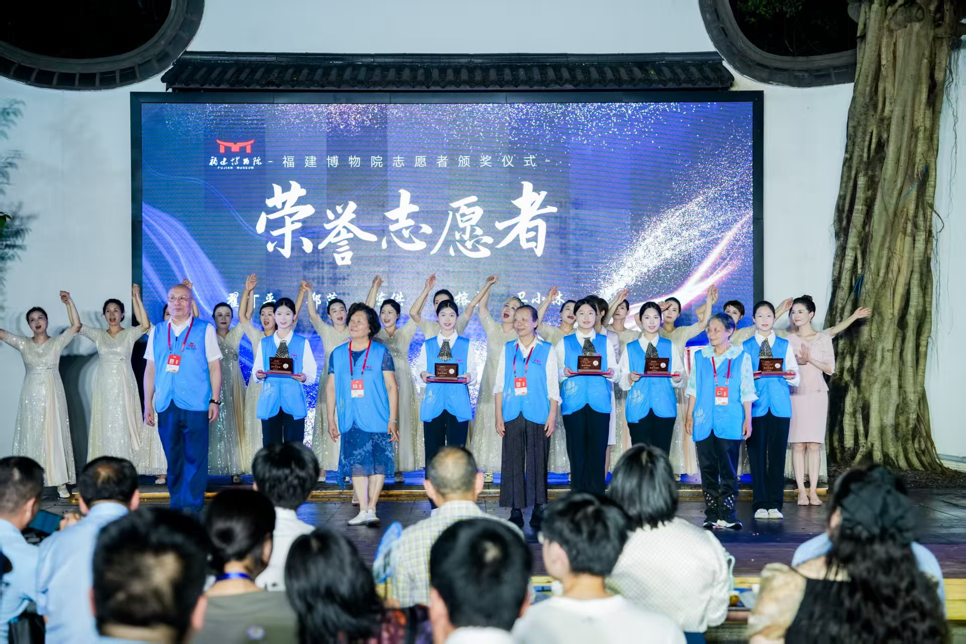 当晚,“福韵流长 博物致知——福博蓝主题博物馆之夜”也于西湖之滨盛大启幕。活动巧妙融合传统与现代,古今元素激烈碰撞,带来别样视听盛宴。现场,古老文物与现代科技交相辉映,在场嘉宾与市民沉浸其中,纷纷啧啧称赞,尽享八闽文化魅力。活动最后,举行了福博2024年度十佳志愿者、卓越志愿者、功勋志愿者和荣誉志愿者颁奖仪式。