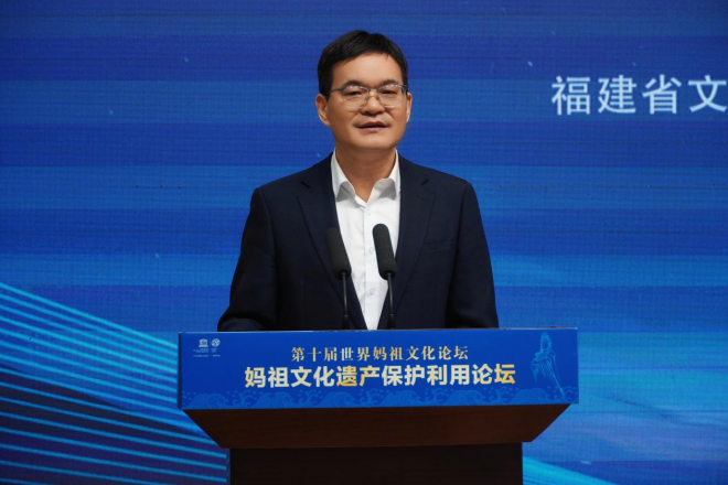 “因为妈祖,文化有脉、文明有象、文物有形。”福建省文化和旅游厅党组成员、副厅长、省文物局局长傅柒生在致辞中,从文化、文明和文物三个维度阐述了妈祖文化的历史底蕴、精神内涵与时代价值。他指出,妈祖文化是中华民族重要的符号标识和精神载体,其“立德、行善、大爱”的精神彰显了中华文明的鲜明特色。当前,从湄洲祖庙到遍布全球的宫庙,妈祖文化遗产已形成庞大体系,保护传承意义巨大、任务繁重。他强调,加强妈祖文化遗产保护传承正是妈祖“立德、行善、大爱”精神最生动的诠释与实践,福建将立足新起点,锚定两岸融合发展示范区建设目标,以妈祖文化为纽带,深化系统性保护,拓展融合性交流,推动创造性转化和创新性发展,让千年妈祖文化遗产绽放新时代光彩。