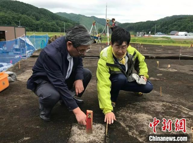 白云翔教授(左)在日本北海道千岁市厚真町幌内遗址考古发掘工地与发掘者现场交流