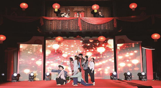 傍晚6时许,漳州市南靖县梅林镇张灯结彩、游客如织,百年土楼万德楼内华灯初上、古韵生辉。步入大门,正前方的舞台上,歌曲、舞蹈、话剧等表演轮番上阵走位,舞台下20桌宴席已整齐摆好,只待除夕之夜海内外游客齐聚一堂、共同围炉。