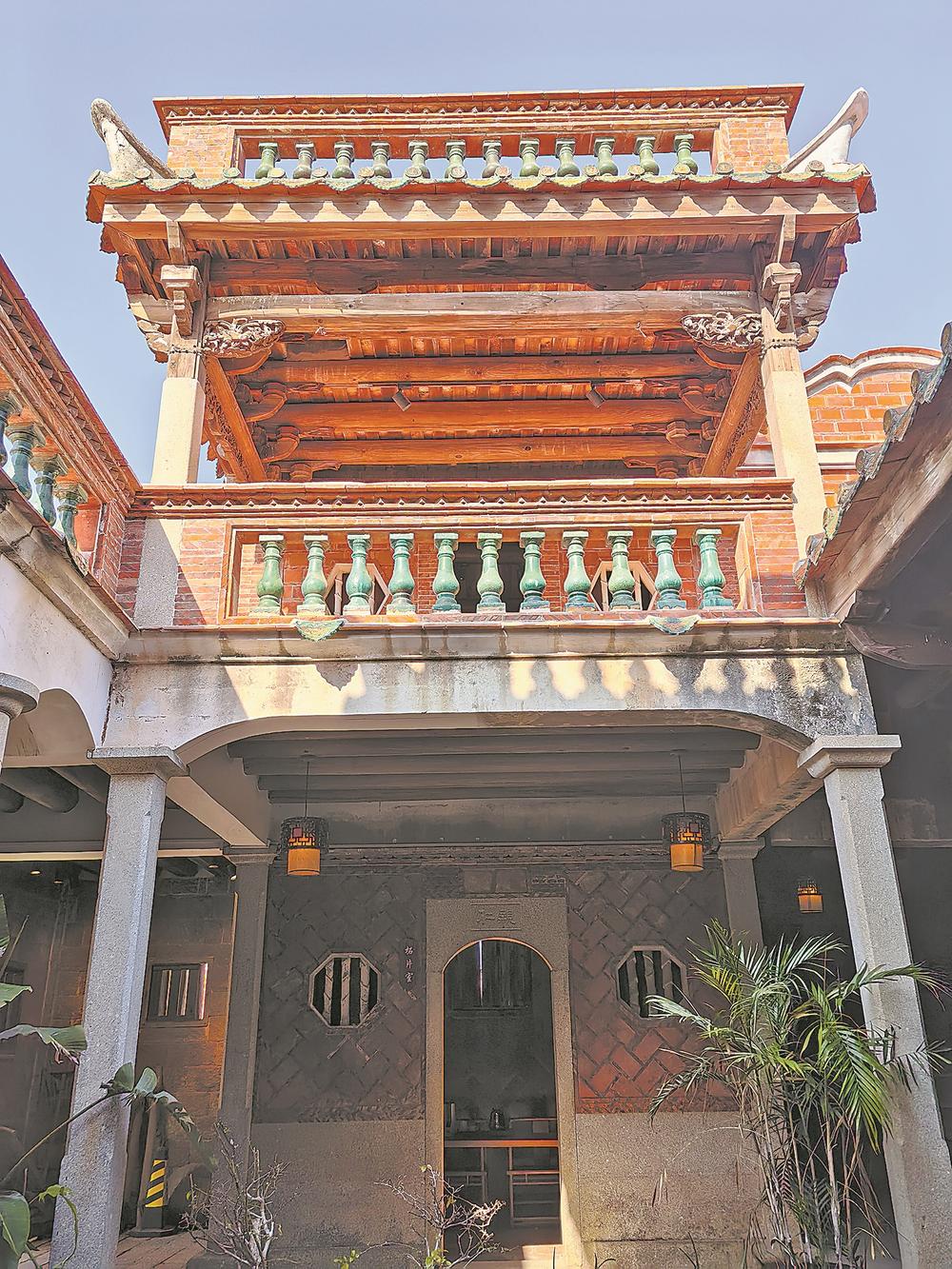 与闽南古厝不同的是,蔡衍湖宅正立面墙体为平齐构造,没有采用传统的“塌寿”做法。“塌寿”是闽南一带的叫法,即“凹肚门楼”,就是把前厅斫为两截,内截为前厅或前庭,外截为凹陷进去的门楼。“这样一来,整堵由花岗岩和红砖砌筑的镜面墙更显张力,色泽也更加艳丽。”李国宏说。