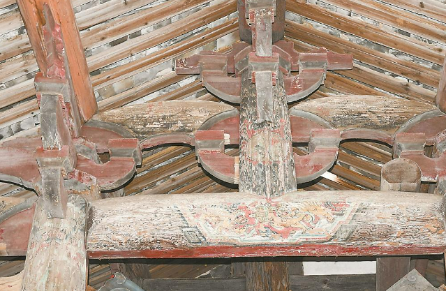 正殿是明代早期厅堂风格,4根粗硕的梭柱格外醒目。据介绍,这4根梭柱支撑起了整个正殿的核心主架,梭柱腹部隆起、上下收分明显,采用兼具抬梁式和穿斗式特点的混合架构,是浙、闽、粤等南方地区的典型做法。2根大梁与3根瓜柱形成“二通三瓜”的样式,瓜柱两侧及束木端头作丁头拱,整体风格用材粗犷,造型古朴但规制严谨,符合明代风格。