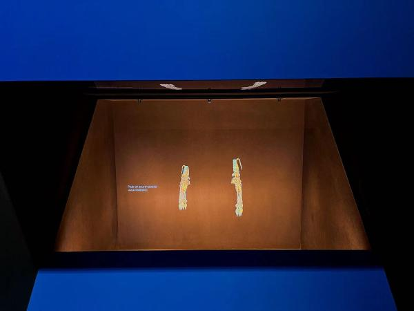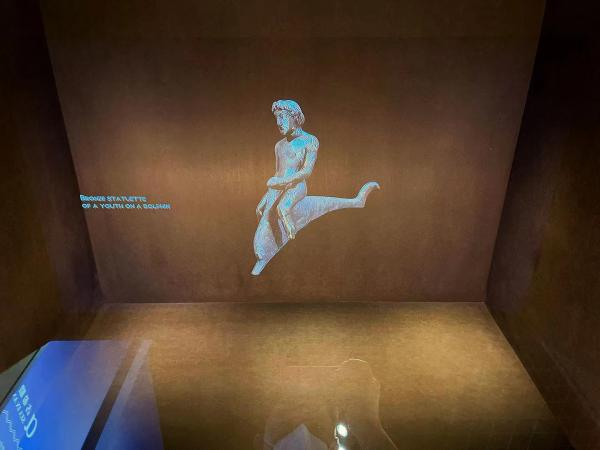 主题墙一侧,是此次展览的第一板块“古希腊艺术中的海洋”,展出5件古希腊文物的全息投影。这个特殊的展柜之中,观众可以看到雅典卫城博物馆所藏青铜雕像《骑海豚的青年》、马格尼西亚古物局/沃洛斯考古博物馆所藏船型金耳环(一对)、塞萨洛尼基考古博物馆所藏船型金耳环(一对),以及雅典国家考古博物馆所藏青铜雕像《波塞冬像》和阿提卡红绘带盖盒。这5件文物分别诞生于公元前5世纪至公元前2世纪之间。