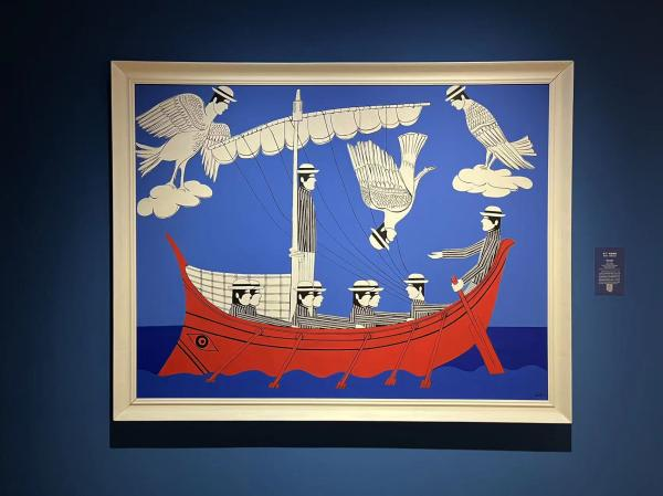 与“美人鱼”相对的则是“海妖塞壬”——扬尼斯•盖蒂斯所作油画《塞壬—奥德修斯》。这一创作于1980年的油画取材自荷马史诗《奥德赛》的主角、古希腊神话英雄奥德修斯的传说。特洛伊战争之后,奥德修斯在海上漂流十年,为抵御鸟头人身的海妖塞壬美妙歌声的诱惑,他让水手们将自己绑在桅杆上。据介绍,扬尼斯•盖蒂斯这件作品构图与大英博物馆藏的一件古代陶瓶上的图案如出一辙,但扬尼斯用戴着帽子的男性取代了海妖塞壬传统的女性头像,奥德修斯和水手们同样头戴帽子、身着条纹衬衫——重复的形象将传说与当代消费主义社会结合在一起。